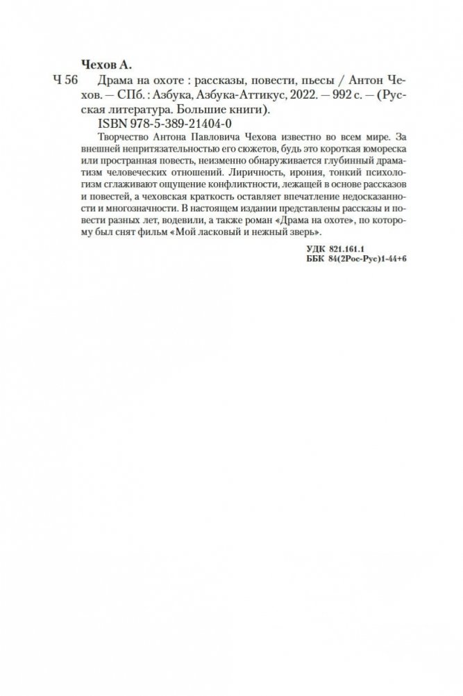 Творчество Антона Павловича Чехова известно во всем мире. За внешней непритязательностью его сюжетов, будь это короткая юмореска или пространная повесть, неизменно обнаруживается глубинный драматизм человеческих отношений. Лиричность, ирония, тонкий психологизм сглаживают ощущение конфликтности, лежащей в основе рассказов и повестей, а чеховская краткость оставляет впечатление недосказанности и многозначности. В настоящем издании представлены рассказы и повести разных лет, водевили, а также роман «Драма на охоте», по которому был снят фильм «Мой ласковый и нежный зверь».