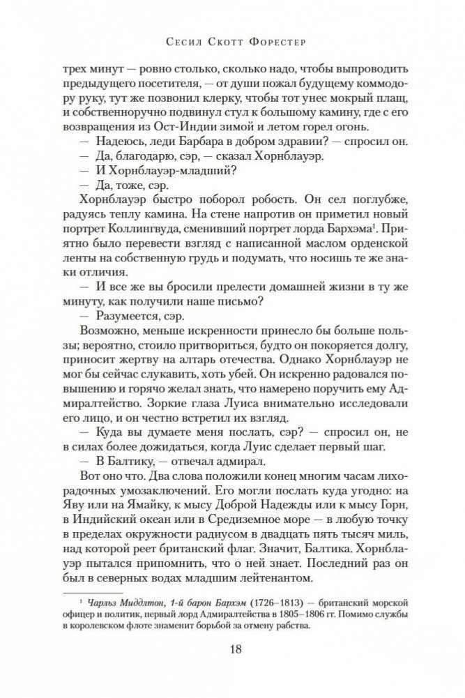 Сага об офицере королевского флота Великобритании Горацио Хорнблауэре, прошедшем славный и трудный путь от простого мичмана до лорда и адмирала, — уникальное явление в мировой историко-авантюрной литературе. Миллионный круг почитателей, бесконечные тиражи, поистине мировое признание, выведшее писателя в классики жанра, кино- и телеверсии с участием таких известных актеров, как Грегори Пек, Кристофер Ли, и других звезд мирового кинематографа. Автор саги, Сесил Скотт Форестер, говорил о своем герое: «Он доставил мне бесчисленных друзей по всему миру. Таможенники читают мою фамилию и пропускают мой багаж, не досматривая. Он свел меня с адмиралами и принцессами, и я благодарен ему, честное слово, хотя и думаю часто, что лучше б ему этого не делать». Не каждому писателю настолько повезло с персонажем. Сага о Горацио Хорнблауэре оставила заметный литературный след. Книжный сериал Бернарда Корнуэлла о стрелке Шарпе создавался под влиянием Форестера. Патрик О’Брайен, отталкиваясь от книг знаменитой саги, написал многотомную эпопею о капитане Обри. Даже Гарри Гаррисон спародировал по-доброму образ героя Форестера в одном из своих рассказов («Капитан Гонарио Харпплейер»). Книга завершает повествование о морских подвигах Горацио Хорнблауэра — личности, которая, по словам Уинстона Черчилля, «вызывает из прошлого великий и суровый образ королевского флота в эпоху его славы».