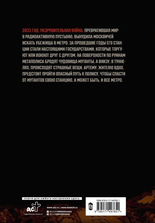 2033 год. Разрушительная война, превратившая мир в радиоактивную пустыню, вынудила москвичей искать убежища в метро. За прошедшие годы его станции стали настоящими государствами, которые торгуют или воюют друг с другом. На поверхности по руинам мегаполиса бродят чудовища‑мутанты, а внизу, в туннелях, происходят страшные вещи. Артему, жителю ВДНХ, предстоит пройти опасный путь к Полису, чтобы спасти от мутантов свою станцию, а может быть, и все метро.