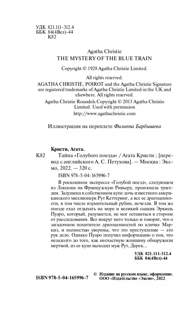 В роскошном экспрессе «Голубой поезд», следующем из Лондона на Французскую Ривьеру, произошла трагедия. Задушена в собственном купе дочь известного американского миллионера Рут Кеттеринг, а все ее драгоценности, в том числе изумительный рубин, исчезли. В том же поезде ехал отдыхать на море и великий сыщик Эркюль Пуаро, который, разумеется, не мог оставаться в стороне от расследования.