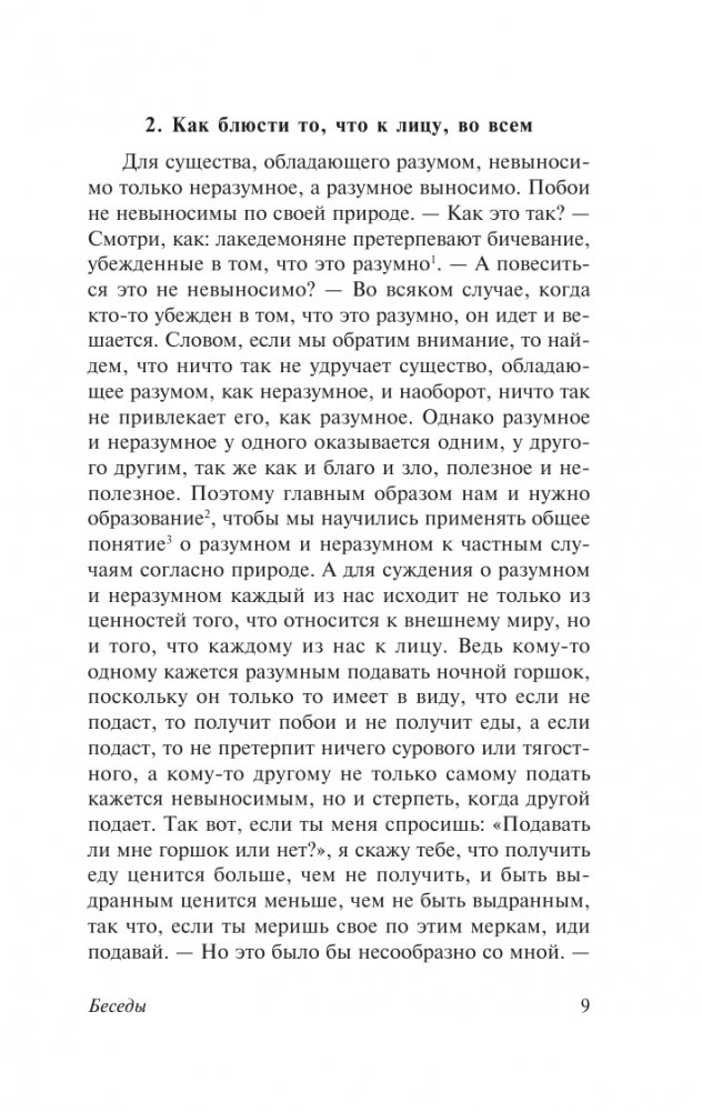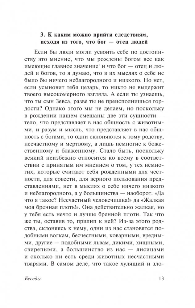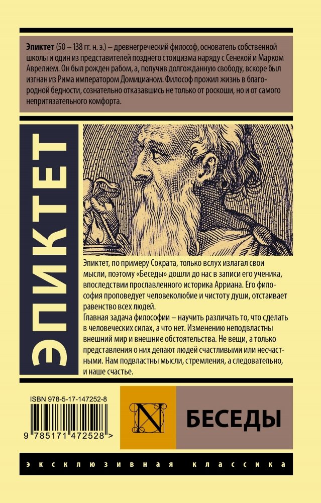 Эпиктет, по примеру Сократа, только вслух излагал свои мысли, поэтому "Беседы" дошли до нас в записи его ученика, впоследствии прославленного историка Арриана. Его философия проповедует человеколюбие и чистоту души, отстаивает равенство всех людей.