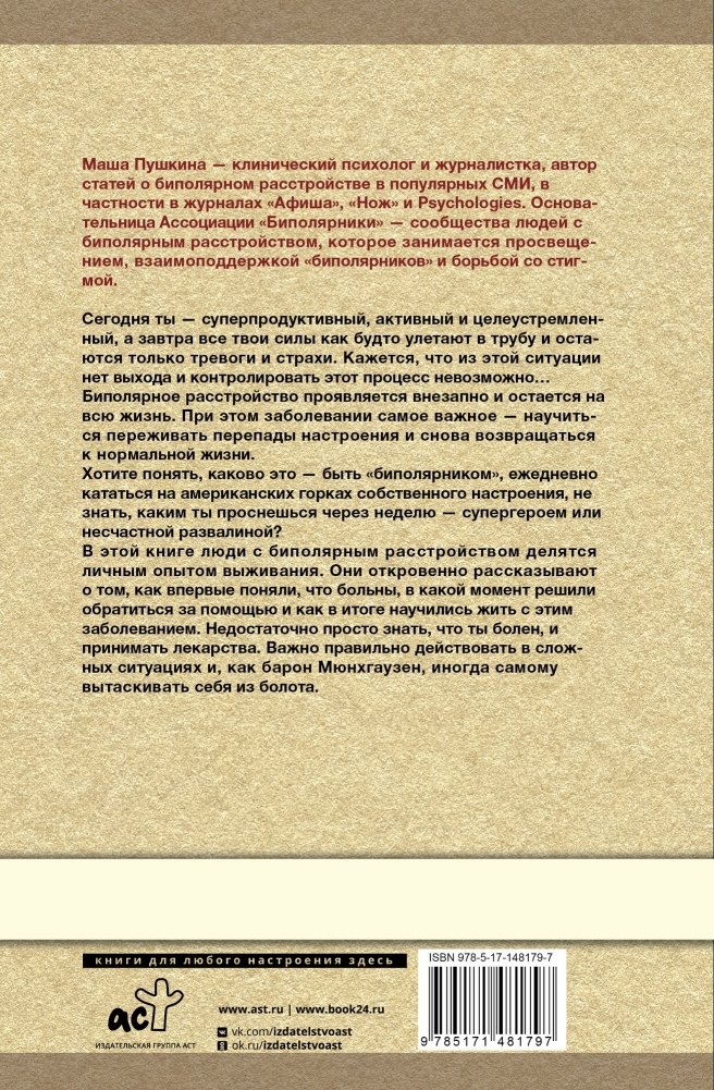 Биполярное расстройство в наше время — один из частых диагнозов современного человека. И научиться с ним гармонично жить — важная задача каждого биполярника. В книге «Биполярка: как живут и справляются с собой люди с биполярным расстройством» собраны реальные истории и методы избавления от американских горок нашего настроения, которые сильно мешают нам жить.