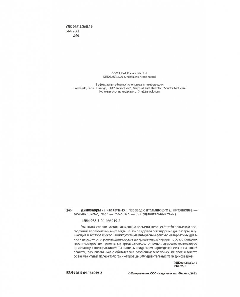 Приготовься: тебя ждёт самое невероятное приключение за 65 000 000 лет! Эта книга раскроет 500 удивительных, порой совершенно необъяснимых, а иногда даже шокирующих тайн динозавров, безраздельно царствовавших на Земле в мезозойскую эру. Ты узнаешь, каковы были истинные размеры и умственные способности древних ящеров, чем они питались, как общались друг с другом и сражались с врагами, где обитали и почему в конце концов вымерли. А затем ты вернёшься из далёких времён обратно в наши дни и вместе с бравыми палеонтологами поучаствуешь в увлекательных баталиях, то и дело разворачивающихся вокруг загадочных окаменелых останков первобытных гигантов!
