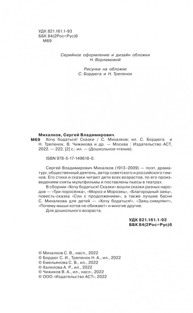 В сборник "Хочу бодаться! Сказки" вошли сказки разных народов – "Три поросёнка", "Мороз и Морозец", "Благородный заяц", повесть-сказка "Сон с подолжением", а также лучшие басни С. Михалкова для детей – "Хочу бодаться!", "Заяц-симулянт", "Почему мыши котов не обижают" и многие другие.