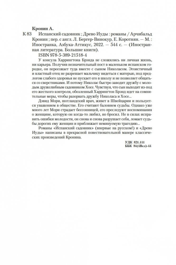 У консула Харрингтона Брэнда не сложились ни личная жизнь, ни карьера. Получив незначительный пост в маленьком испанском городке, он переезжает туда вместе с сыном Николасом. Эгоистичный и властный отец не разрешает мальчику видеться с матерью, под предлогом слабого здоровья не пускает его в школу и не позволяет общаться со сверстниками. И потому Николас быстро заводит дружбу с молодым дружелюбным садовником Хосе. Чувствуя, что сын выходит из-под его жесткого контроля, обозленный Харрингтон Брэнд идет на сомнительные меры, чтобы разорвать дружбу Николаса и Хосе… Дэвид Мори, шотландский врач, живет в Швейцарии и пользуется уважением в обществе. Его считают баловнем судьбы. Однако уже много лет Мори страдает бессонницей, его преследуют воспоминания о женщине, которую он когда-то любил, но бросил. Не в силах исправить ошибки молодости, он снова и снова разрушает себя, ломает судьбы дорогих ему женщин и приближает неминуемую трагедию… Романы «Испанский садовник» (впервые на русском!) и «Древо Иуды» написаны в прекрасной повествовательной манере классических произведений Кронина.