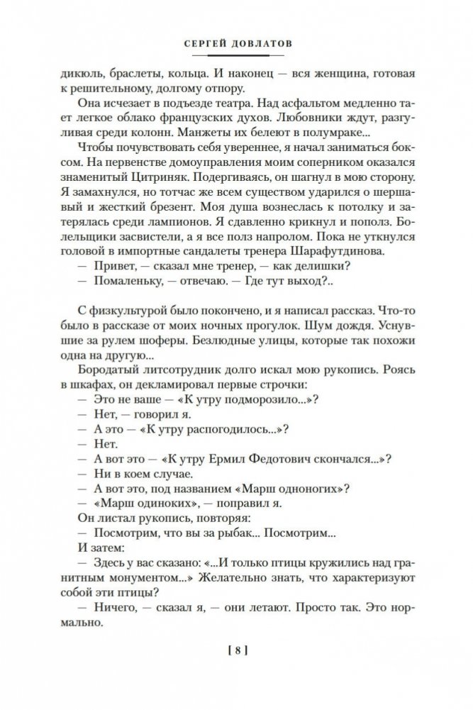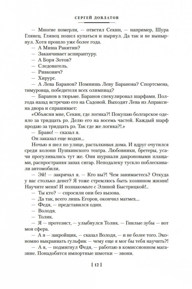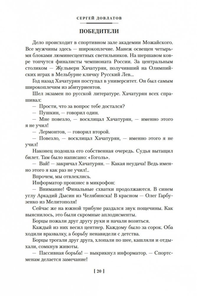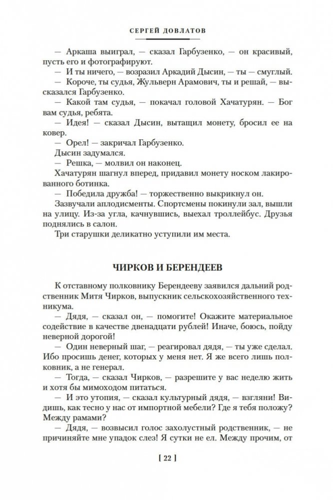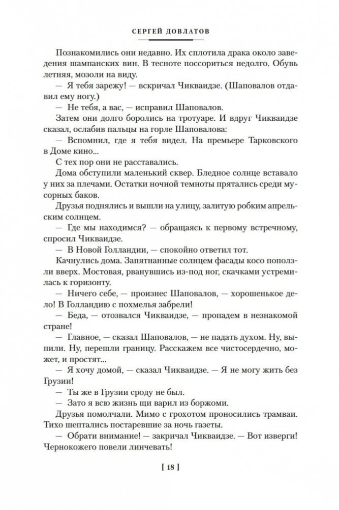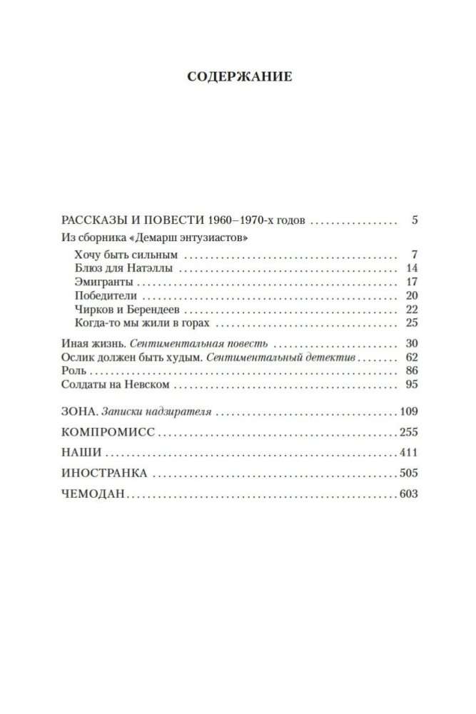 Сергей Довлатов — один из самых популярных и читаемых русских писателей конца ХХ века, и он «обречен» оставаться таким еще долгое время. Его произведения — та самая великая классика, которая, при всей своей значимости, остается интересной и близкой читателям, независимо от возраста, национальности, эрудиции или, говоря словами самого Довлатова, «степени интеллектуальной придирчивости». Лев Лосев сформулировал это качество довлатовской прозы так: «Довлатов знал секрет, как писать интересно». В настоящее издание вошли ранние рассказы и повести Довлатова, а также широко известные и любимые произведения: «Зона», «Компромисс», «Наши», «Иностранка» и «Чемодан».