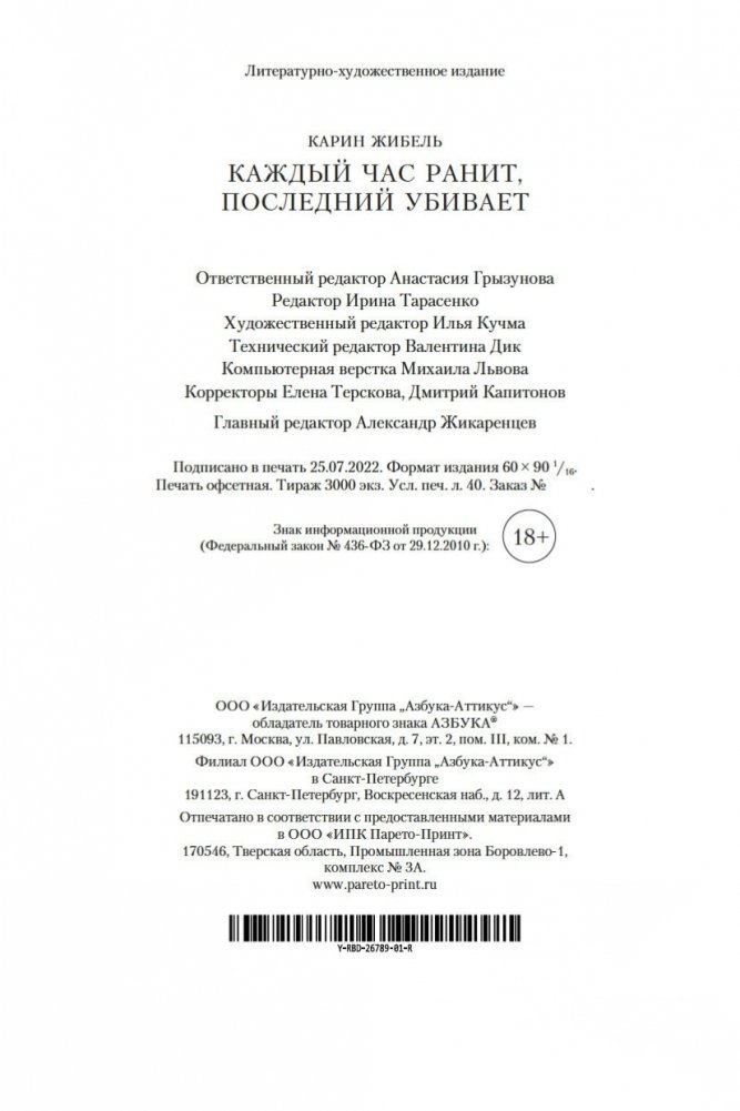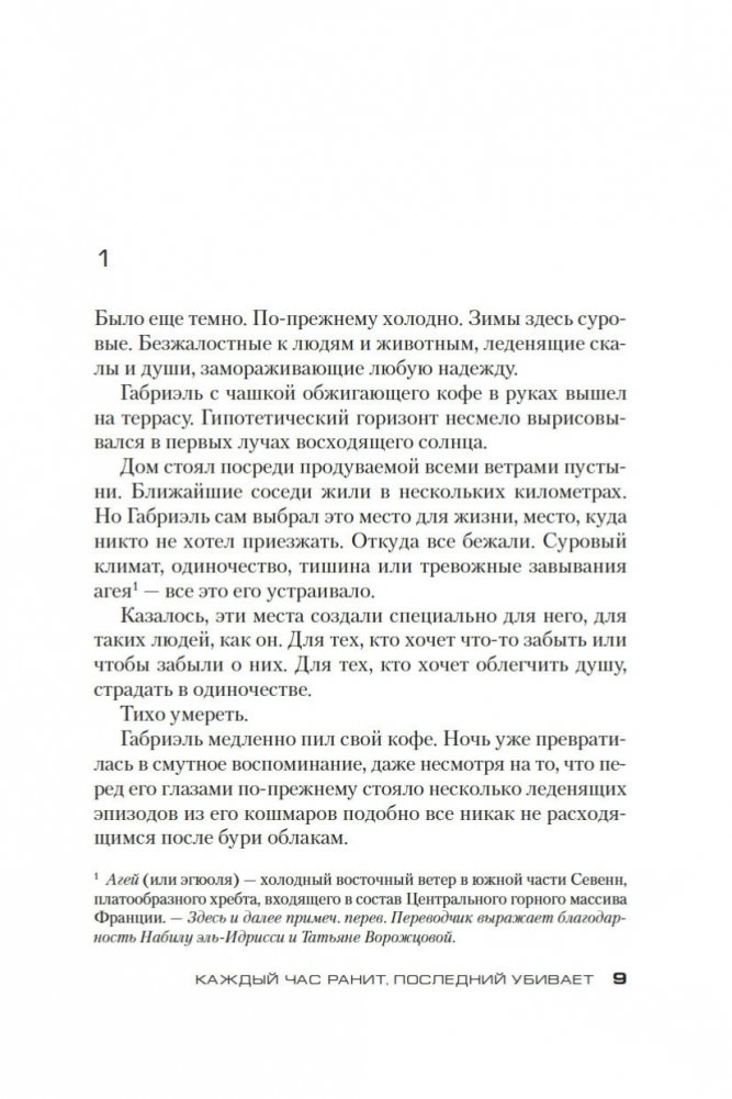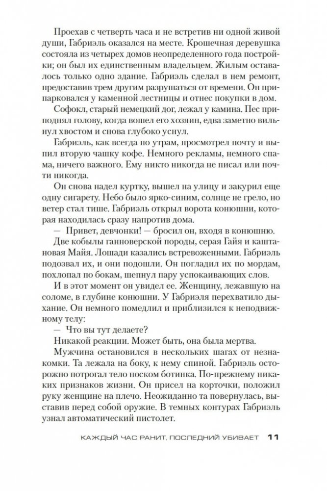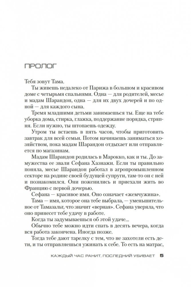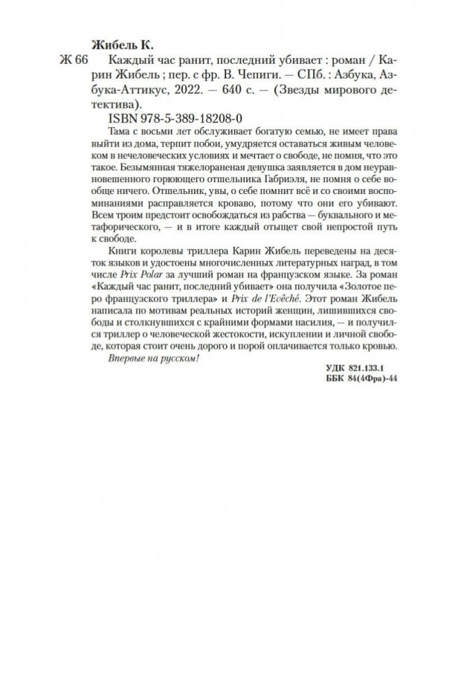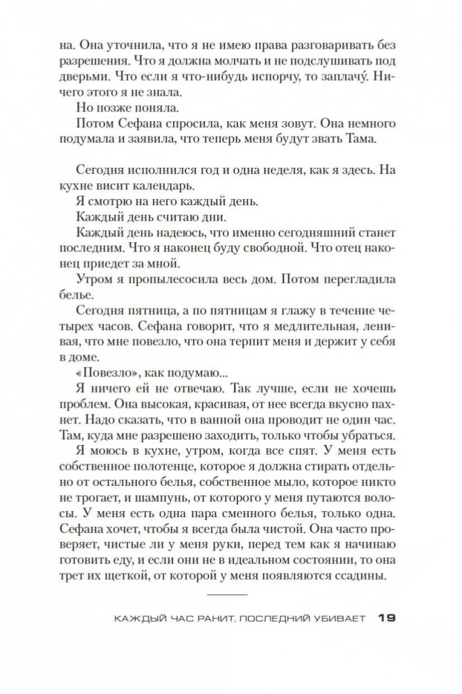 Тама с восьми лет обслуживает богатую семью, не имеет права выйти из дома, терпит побои, умудряется оставаться живым человеком в нечеловеческих условиях и мечтает о свободе, не помня, что это такое. Безымянная тяжелораненая девушка заявляется в дом неуравновешенного горюющего отшельника Габриэля, не помня о себе вообще ничего. Отшельник, увы, о себе помнит всё и со своими воспоминаниями расправляется кроваво, потому что они его убивают. Всем троим предстоит освобождаться из рабства — буквального и метафорического, — и в итоге каждый отыщет свой непростой путь к свободе. Книги королевы триллера Карин Жибель переведены на десяток языков и удостоены многочисленных литературных наград, в том числе Prix Polar за лучший роман на французском языке. За роман «Каждый час ранит, последний убивает» она получила «Золотое перо французского триллера» и Prix de l’Evêché. Этот роман Жибель написала по мотивам реальных историй женщин, лишившихся свободы и столкнувшихся с крайними формами насилия, — и получился триллер о человеческой жестокости, искуплении и личной свободе, которая стоит очень дорого и порой оплачивается только кровью. Впервые на русском!
