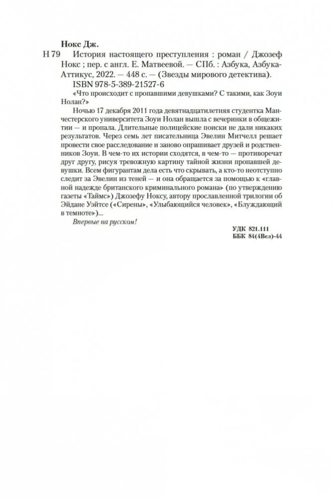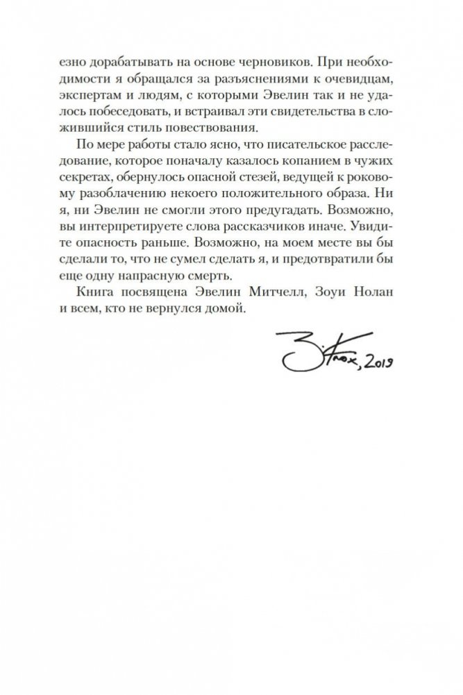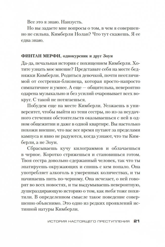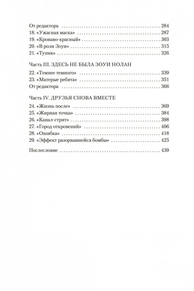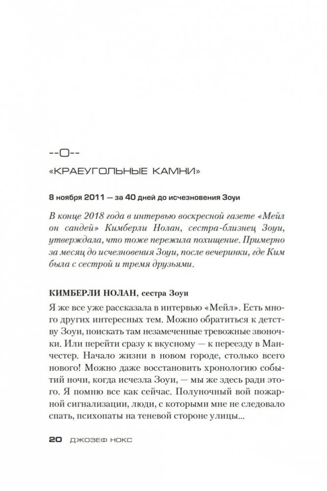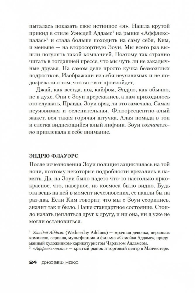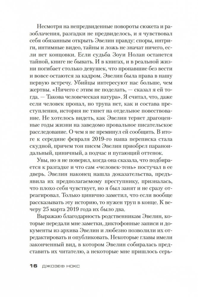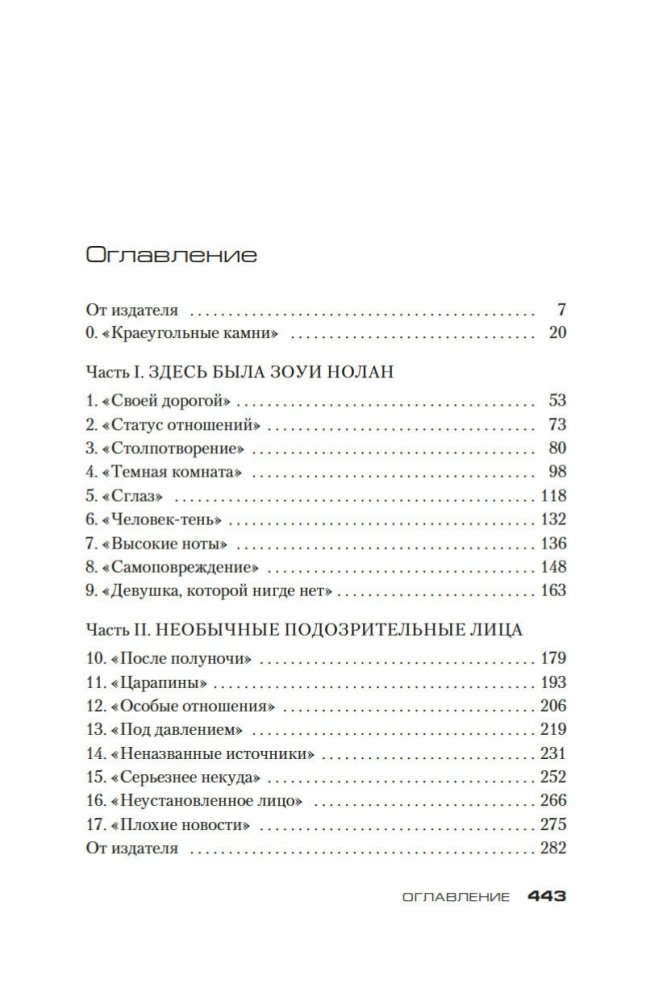 «Что происходит с пропавшими девушками? С такими, как Зоуи Нолан?» Ночью 17 декабря 2011 года девятнадцатилетняя студентка Манчестерского университета Зоуи Нолан вышла с вечеринки в общежитии — и пропала. Длительные полицейские поиски не дали никаких результатов. Через семь лет писательница Эвелин Митчелл решает провести свое расследование и заново опрашивает друзей и родственников Зоуи. В чем-то их истории сходятся, в чем-то — противоречат друг другу, рисуя тревожную картину тайной жизни пропавшей девушки. Всем фигурантам дела есть что скрывать, а кто-то неотступно следит за Эвелин из теней — и она обращается за помощью к «главной надежде британского криминального романа» (по утверждению газеты «Таймс») Джозефу Ноксу, автору прославленной трилогии об Эйдане Уэйтсе («Сирены», «Улыбающийся человек», «Блуждающий в темноте»)… Впервые на русском!