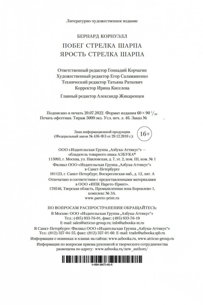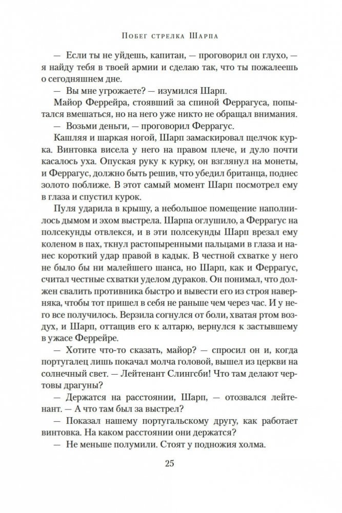 В начале девятнадцатого столетия Британская империя простиралась от пролива Ла-Манш до Индийского океана. Одним из строителей этой империи, участником всех войн, которые вела в ту пору Англия, был стрелок Шарп. В романе «Побег стрелка Шарпа» только от героя зависит, захватит ли победоносная армия Наполеона Португалию. Жизнь Шарпа постоянно висит на волоске, опасность подстерегает его со всех сторон. Шарпу придется противостоять завистливым и некомпетентным вышестоящим офицерам, мнимым союзникам, готовым предать в любую минуту, и коварному неприятелю. В романе «Ярость стрелка Шарпа» английская армия стоит на пороге поражения. Испания попала под власть французов. Остался непокоренным только Кадис, за стенами которого идет хитроумная дипломатическая игра. Единственная надежда британцев — Шарп и его однополчане, не желающие признать свое поражение.