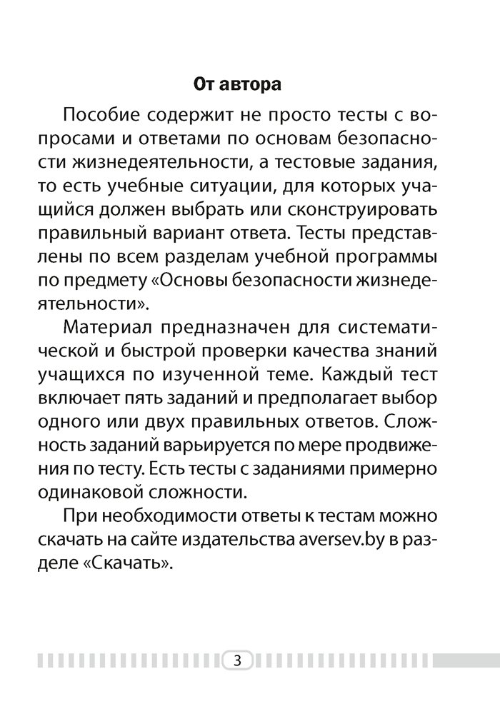 В пособии представлены тесты по всем разделам учебной программы «Основы безопасности жизнедеятельности». Материал предназначен для систематической и быстрой проверки качества знаний. Каждый тест включает пять заданий, расположенных от простого к сложному.