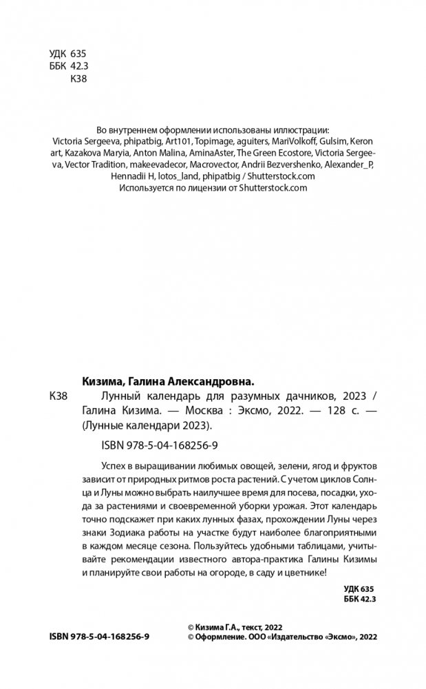 Авторская методика успешного земледелия Галины Кизимы известна многим садоводам и огородникам. Этот лунный календарь разработан специально для тех, кто хочет планировать свои работы на участке, не только ориентируясь на лунные фазы и влияние знаков Зодиака, но, прежде всего, пользуясь разумными и проверенными техниками посева, посадки, ухода, защиты и хранения урожая.