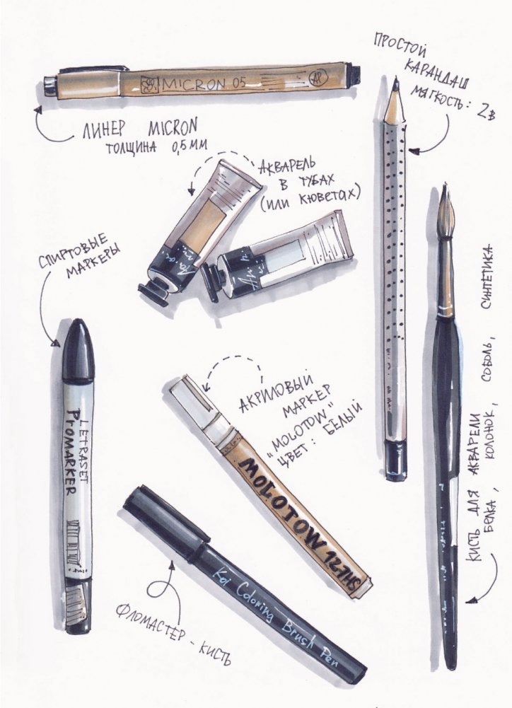 - разберете все необходимые материалы и научитесь пользоваться маркерами, линерами, акварелью и карандашами;