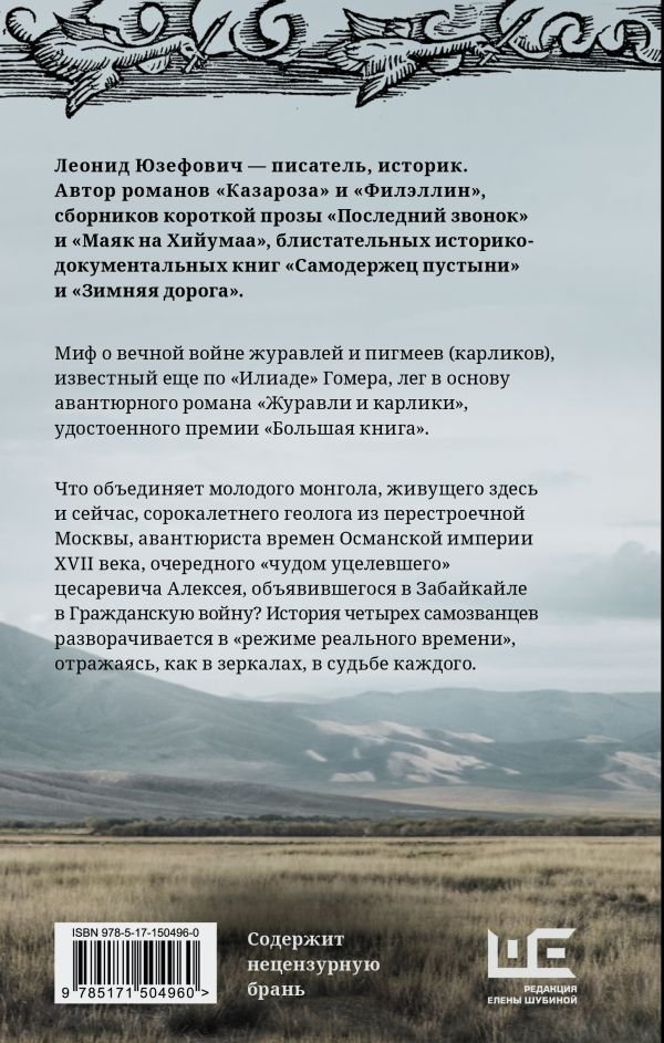 Что объединяет молодого монгола, живущего здесь и сейчас, сорокалетнего геолога из перестроечной Москвы, авантюриста времен Османской империи XVII века, очередного "чудом уцелевшего" цесаревича Алексея, объявившегося в Забайкайле в Гражданскую войну? История четырех самозванцев разворачивается в "режиме реального времени", отражаясь, как в зеркалах, в судьбе каждого.