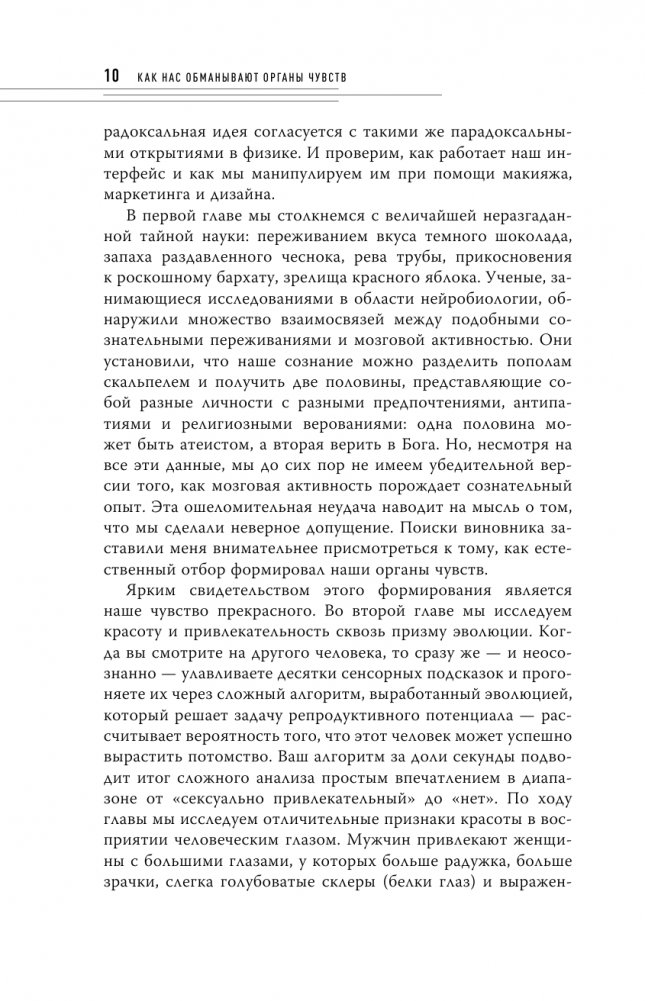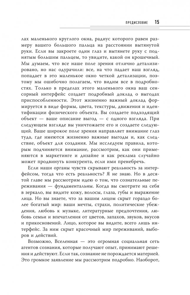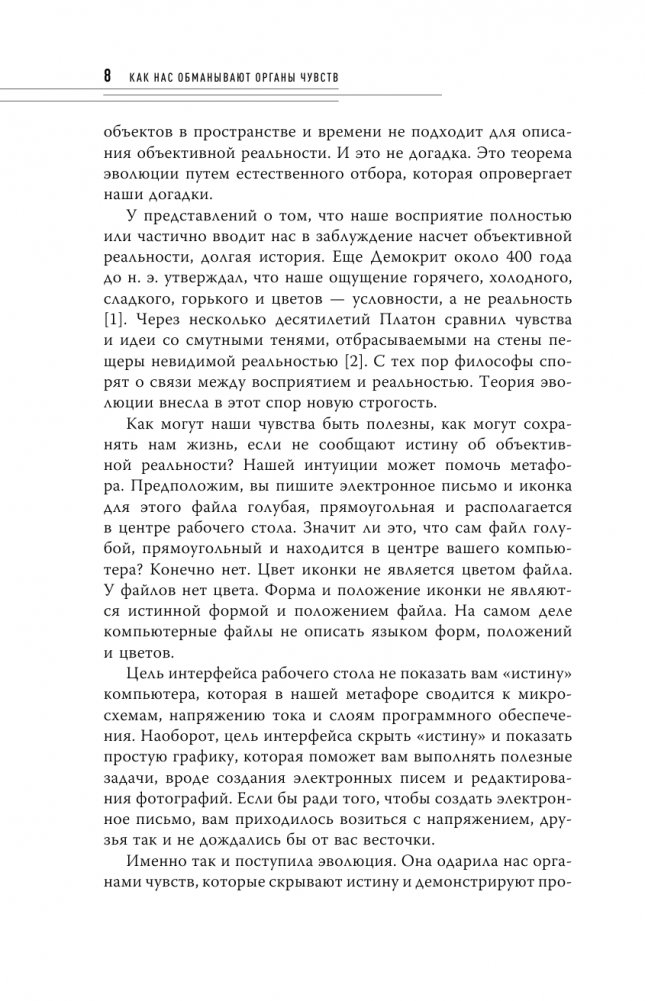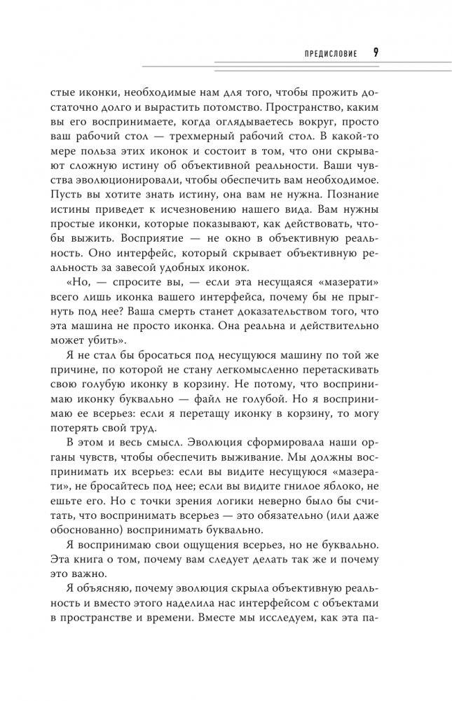 Мы видим мчащийся автомобиль, но не перебегаем перед ним дорогу; мы видим плесень на хлебе, но не едим его. По мнению автора, все эти впечатления не являются объективной реальностью. Последствия такого восприятия огромны: модельеры шьют более приятные к восприятию силуэты, а в рекламных кампаниях используются определенные цвета, чтобы захватить наше внимание. Только исказив реальность, мы можем легко и безопасно перемещаться по миру.