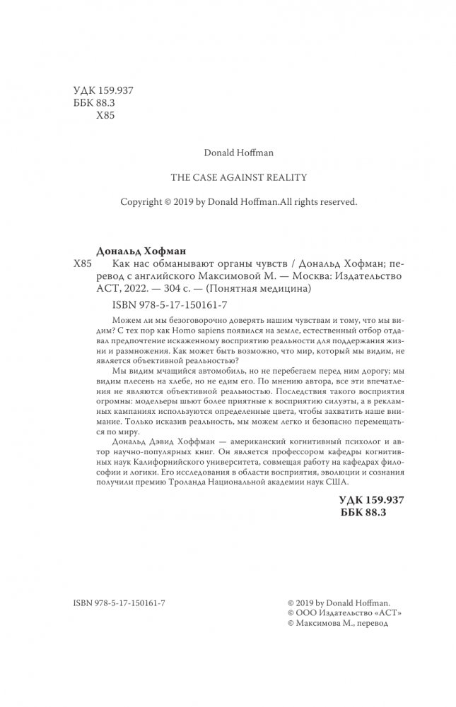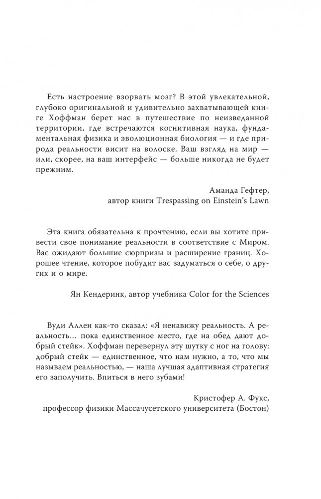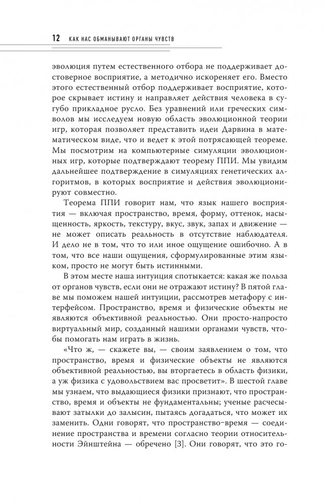 Можем ли мы безоговорочно доверять нашим чувствам и тому, что мы видим? С тех пор как Homo sapiens появился на земле, естественный отбор отдавал предпочтение искаженному восприятию реальности для поддержания жизни и размножения. Как может быть возможно, что мир, который мы видим, не является объективной реальностью?