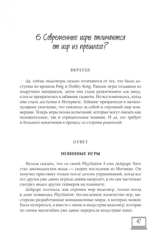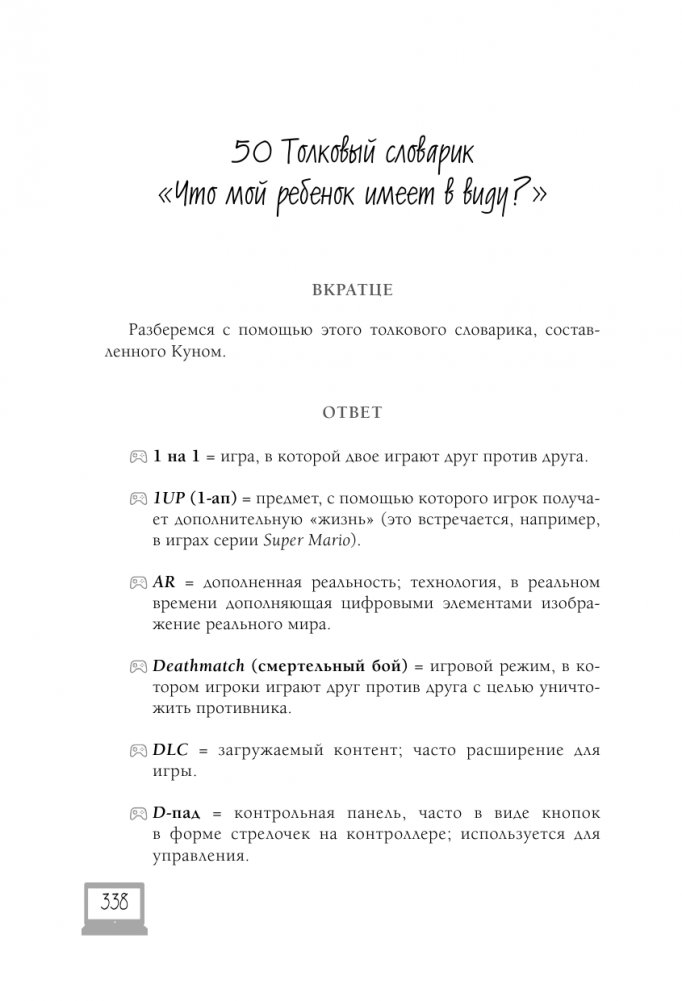 В качестве бонуса в конце книги вы найдете толковый словарик "Что мой ребенок имеет в виду?" – бесценный список терминов с переводом с геймерского на русский