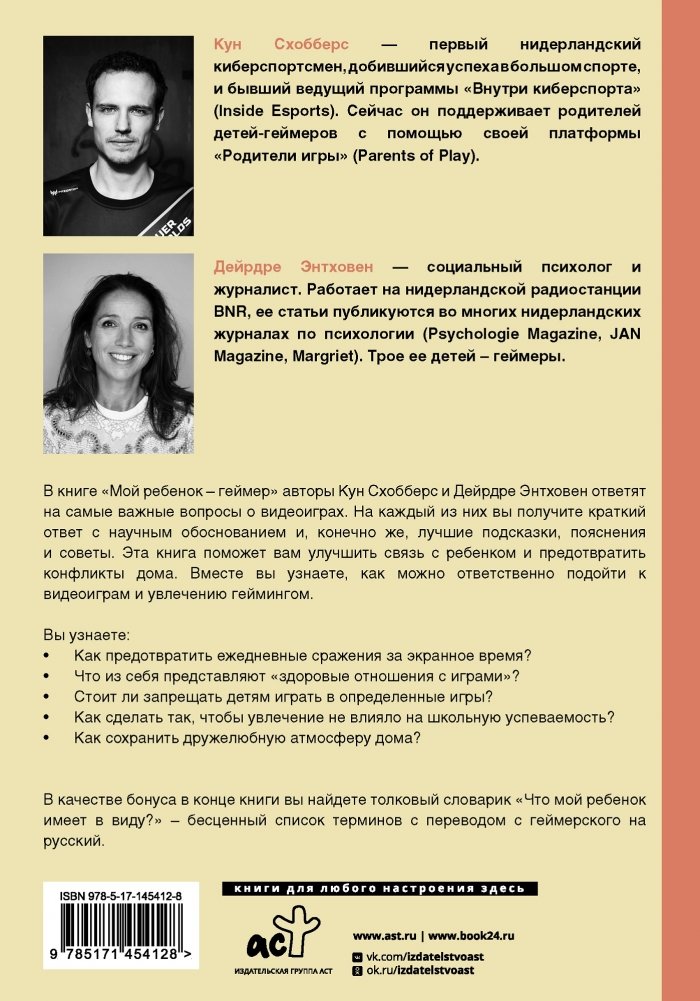 В книге "Мой ребенок – геймер" авторы Кун Схобберс и Дейрдре Энтховен ответят на самые важные вопросы о видеоиграх. На каждый из них вы получите краткий ответ с научным обоснованием и, конечно же, лучшие подсказки, пояснения и советы. Эта книга поможет вам улучшить связь с ребенком и предотвратить конфликты дома. Вместе вы узнаете, как можно ответственно подойти к видеоиграм и увлечению геймингом.