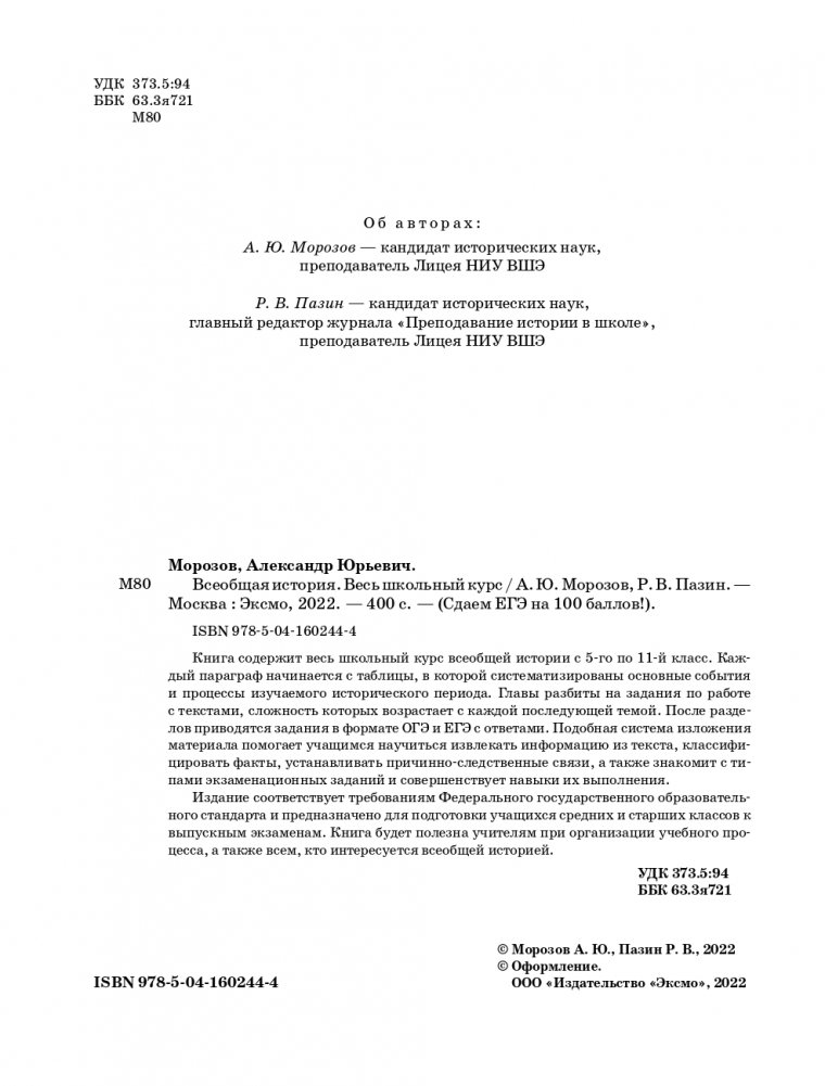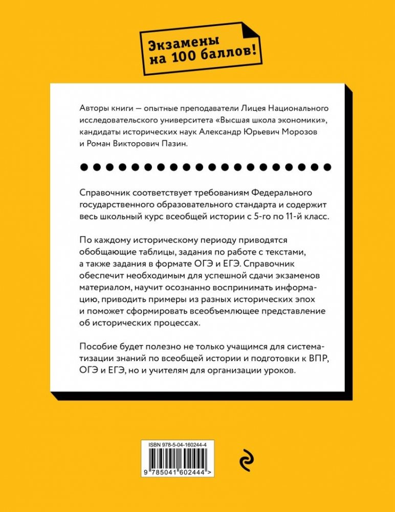 Книга содержит весь школьный курс всеобщей истории с 5-го по 11-й класс. Каждый параграф начинается с таблицы, в которой систематизированы основные события и процессы изучаемого исторического периода. Главы разбиты на задания по работе с текстами, сложность которых возрастает с каждой последующей темой. После разделов приводятся задания в формате ОГЭ и ЕГЭ с ответами. Подобная система изложения материала помогает учащимся научиться извлекать информацию из текста, классифицировать факты, устанавливать причинно-следственные связи, а также знакомит с типами экзаменационных заданий и совершенствует навыки их выполнения.