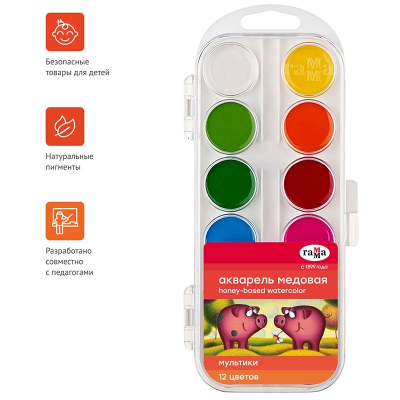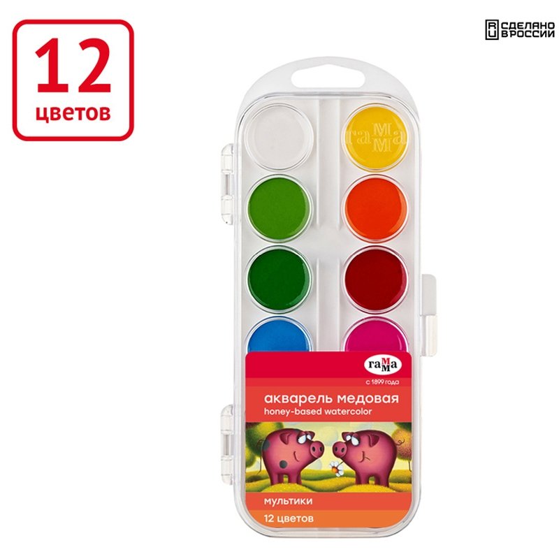 Акварель Гамма "Мультики" NEW, медовая, 12 цветов, без кисти, пластик. упак., европодвес