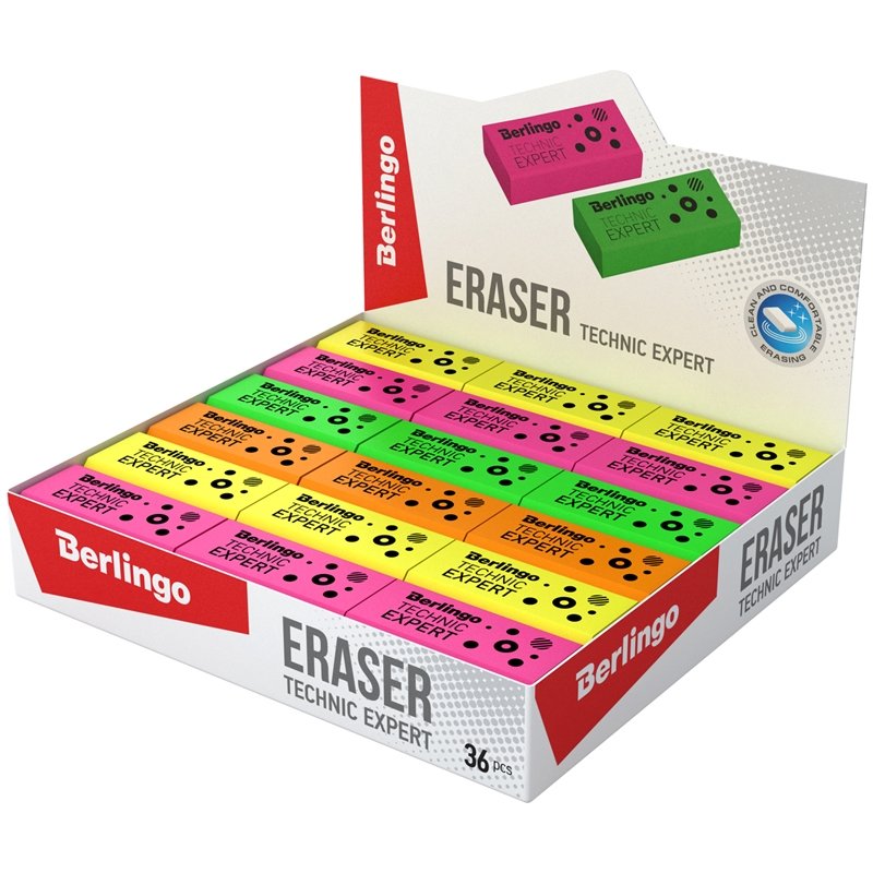 Ластики Berlingo "Technic Expert" выполнены из высококачественного пластика. Не токсичны. Прекрасно справляются с линиями от чернографитного карандаша, не оставляют следов и грязных разводов после себя. Не повреждают бумагу. Дизайн ластиков выполнен в ярких неоновых цветах. Упакованы в яркие картонные дисплей-боксы. У каждого ластика есть штрих-код. 4 цвета ассорти.