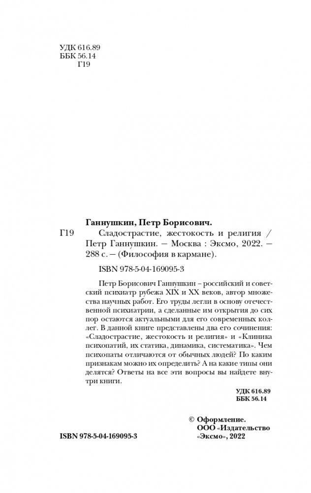 Данная книга включает в себя два основополагающих труда известного советского психиатра Петра Ганнушкина: «Сладострастие, жестокость и религия» и «Клиника психопатий, их статика, динамика, систематика». В этих работах он впервые систематизирует психопатии, а также подробно описывает их признаки и причины возникновения. Теоретические знания подкреплены самыми яркими случаями из почти тридцатилетней медицинской практики Ганнушкина.