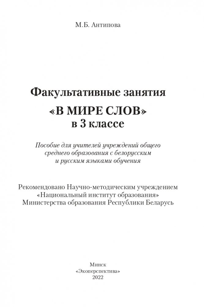 Данное пособие является частью учебно-методического комплекса для факультативных занятий по русскому языку в 3-м классе учреждений общего среднего образования с белорусским и русским языками обучения, в состав которого входит учебная программа для факультативных занятий "Язык родной, дружи со мной..." (в раздел "В мире слов"), а также рабочая тетрадь для учащихся 3-го класса учреждений общего среднего образования с белорусским и русским языками обучения.