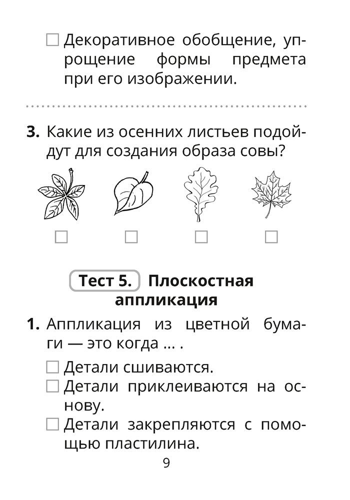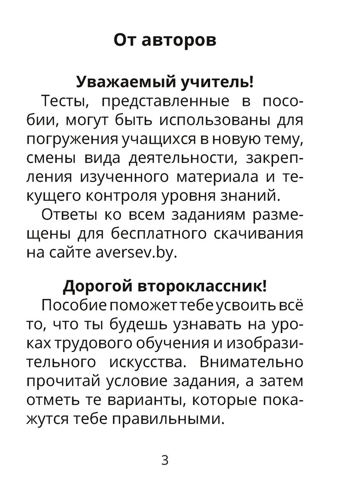 Пособие содержит тесты по двум предметам — трудовому обучению и изобразительному искусству. Тесты могут быть использованы на уроках для знакомства с новыми темами, закрепления полученных знаний, проверки уровня усвоения материала учащимися, обобщения и систематизации изученного.