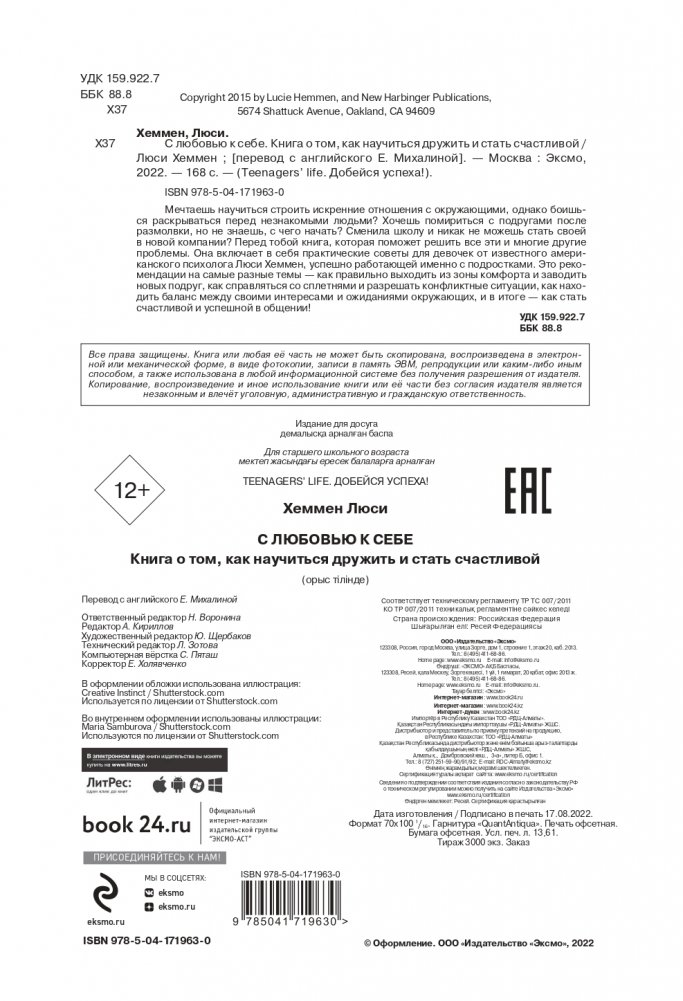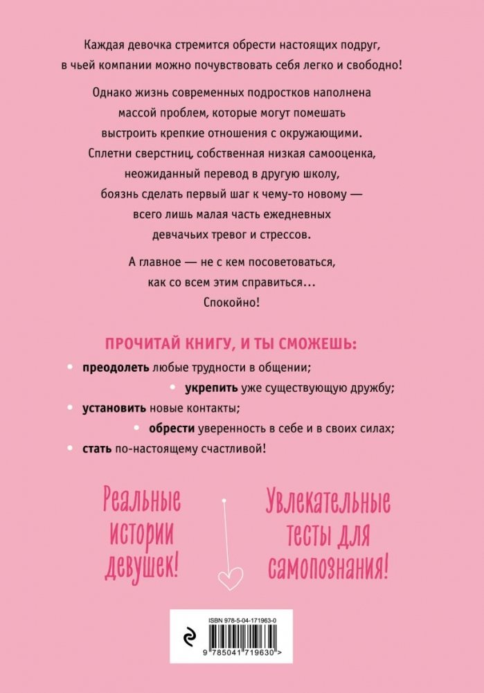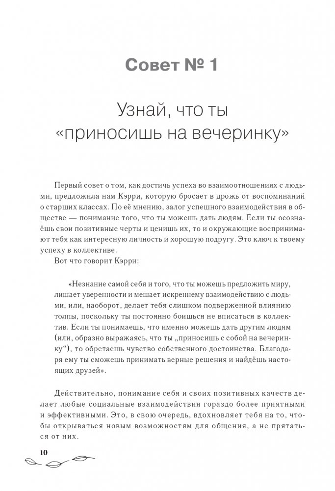 Эта книга выведет тебя из чащи тревог и переживаний, поможет справиться с проблемами в общении, обрести уверенность в себе и своих силах, найти надёжных подруг и стать по-настоящему счастливой! Она включает в себя увлекательные тесты для самопознания и практические советы для девочек от Люси Хеммен — известного психолога, успешно работающего именно с подростками. Эти рекомендации основаны на реальных историях девушек и охватывают самые разные темы: как правильно выходить из зоны комфорта и заводить новых подруг, как справляться со сплетнями и разрешать конфликтные ситуации, как находить баланс между личными интересами и интересами окружающих, и в итоге — как стать успешной в общении!