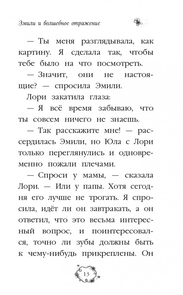 Эмили живёт в доме, который стоит на перекрёстке миров. Стоит зазеваться, открывая дверь или глядя в зеркало, как окажешься в другом мире. Мире, наполненном волшебством, где правят прекрасные и коварные феи. Эмили уже была там однажды и чудом вернулась. А вот теперь ей снова нужно отправиться в этот магический мир, потому что кому-то в нём требуется помощь Эмили. Но сможет ли она второй раз вырваться из мира фей?