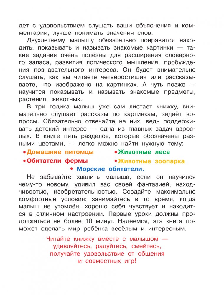 "Первая книга о животных" — прекрасно иллюстрированное издание с крупными наглядными картинками, добрыми стихами и весёлыми загадками. Книга станет замечательным подарком для самых маленьких, позволит раскрыть многообразие мира живой природы в понятной и доступной каждому малышу форме, наполнит жизнь ребёнка новыми интересными впечатлениями и полезными знаниями.