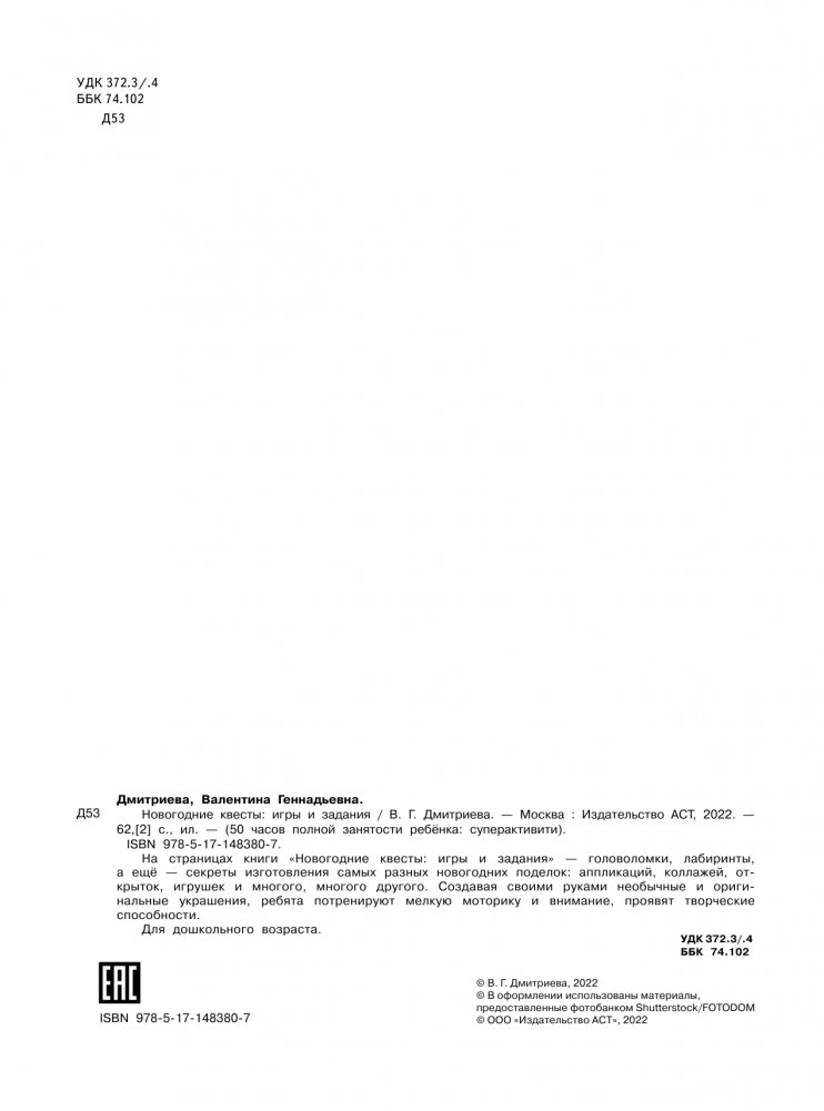 На страницах книги "Новогодние квесты: игры и задания" — головоломки, лабиринты, а ещё — секреты изготовления самых разных новогодних поделок: аппликаций, коллажей, открыток, игрушек и многого, многого другого. Создавая своими руками необычные и оригинальные украшения, ребята потренируют мелкую моторику и внимание, проявят творческие способности.