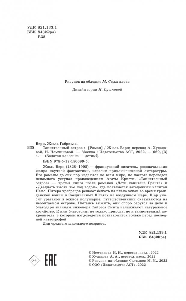Жюль Верн (1828–1905) — французский писатель, родоначальник жанра научной фантастики, классик приключенческой литературы. Его романы до сих пор издаются во всем мире, по частоте переводов ненамного уступая произведениям Агаты Кристи. "Таинственный остров" — третья книга после романов "Дети капитана Гранта" и "Двадцать тысяч лье под водой", где появляется загадочный капитан Немо. Пятеро храбрецов решают бежать из плена южан во время гражданской войны в Соединенных Штатах на воздушном шаре. Шар уносит ураганом в южное полушарие, путешественники оказываются на необитаемом острове. Пытаясь выжить, они споро берутся за дело и благодаря знаниям инженера Сайреса Смита налаживают натуральное хозяйство. К ним благоволит не только природа, но и таинственный покровитель, с которым им доведется познакомится только перед последней катастрофой.