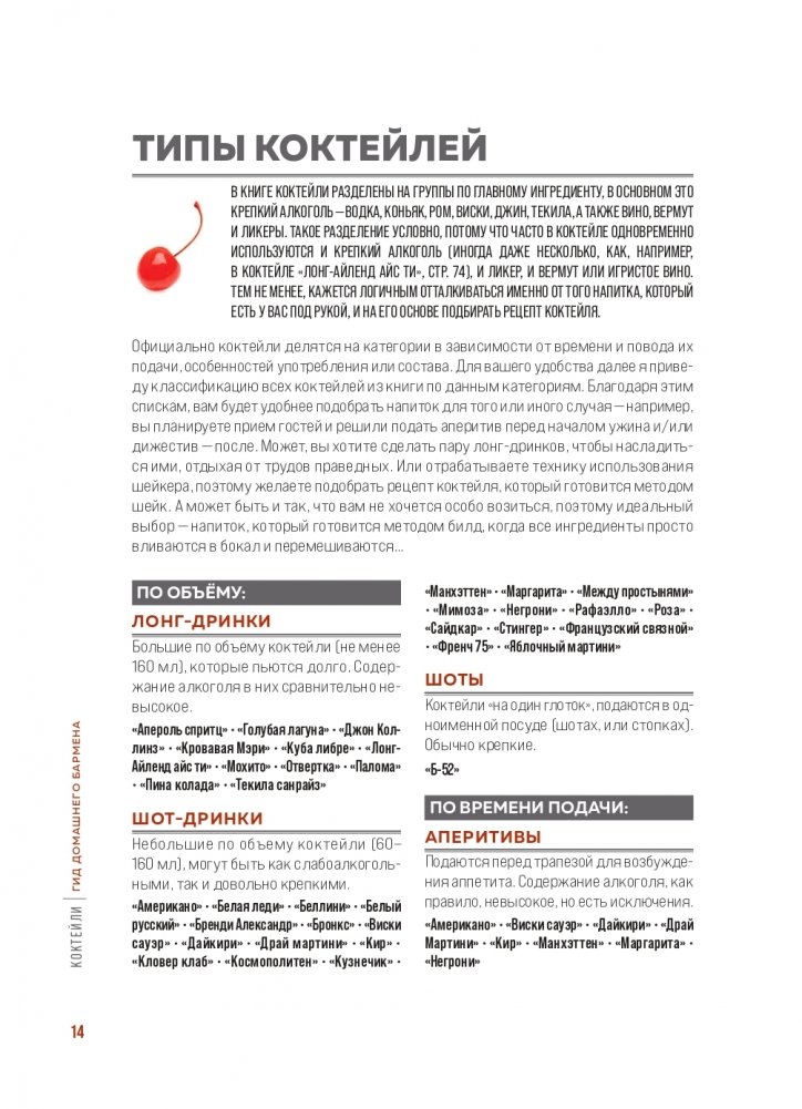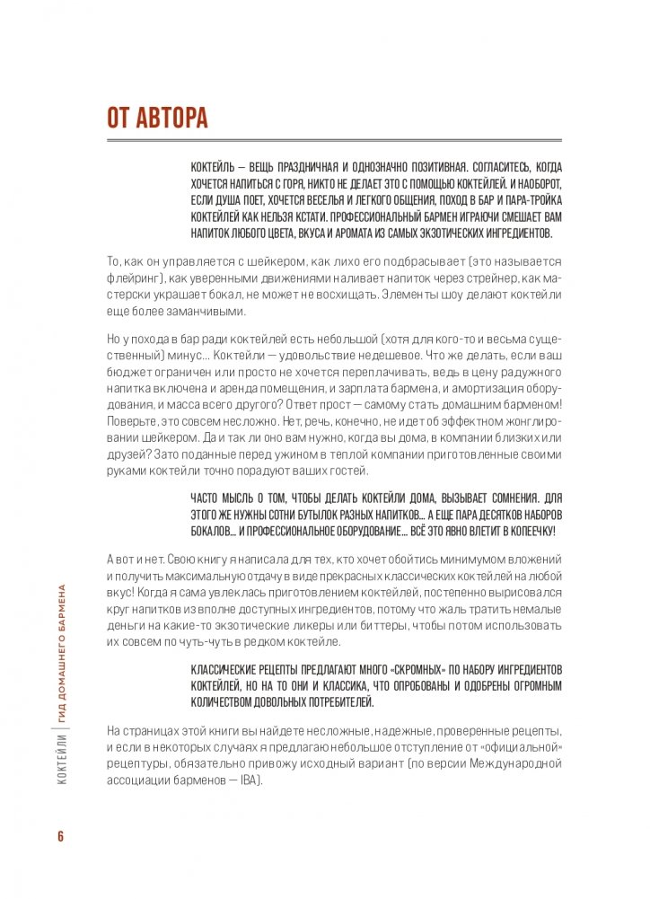 Главной идеей этой книги стала доступность и простота: как ингредиентов, так и посуды, и техник. Здесь нет сложных и трудновоспроизводимых коктейлей с редкими ликерами или дорогими марками спиртного. Рецепты собраны в главы по принципу основного ингредиента, ведь именно он выступает в роли «идейного вдохновителя» будущего коктейля, к нему подбираются все остальные дополнения. Водка, коньяк, ром, виски, джин, текила, вино и вермуты, ликеры — базовые элементы барной классики — станут отправной точкой при выборе коктейля, который вы решите приготовить.