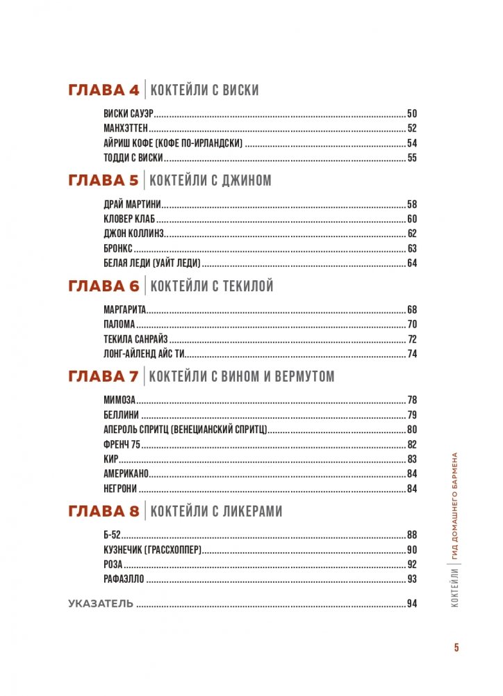 От брутального «Белого русского» до женственной «Мимозы», от игривого «Кузнечика» до прямолинейного «Негрони», от тропической «Пина колады» до горячего кофе по-ирландски — в книге приведено около 40 классических рецептов, а также даны рекомендации по замене ингредиентов, поэтому в итоге количество рецептов гораздо больше. И напитки, которые по ним готовятся, подойдут абсолютно для любого повода, события или времени года.