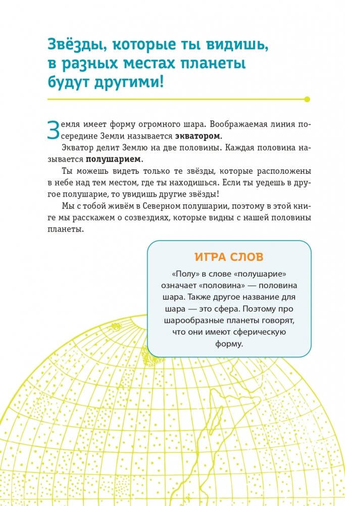 С давних времён люди давали волю воображению и видели в скоплениях звёзд различные фигуры и давали им имена. Со временем наука собрала разные представления в одно целое – и теперь у нас есть цельная и красивая картина неба! Давай посмотрим на неё! С этой книгой ты на практике научишься находить и распознавать простые и сложные созвездия, выяснишь, как рисунок звёздного неба зависит от сезонов года, а также узнаешь, на каких мифах и легендах основаны названия созвездий. Словарь и алфавитный указатель в конце книги помогут тебе запомнить имена всех звёзд!