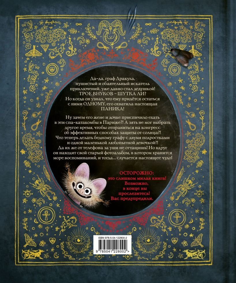 А ведь целых 589 лет пушистый и обаятельный граф Дракула жил спокойно! Но вдруг его жене и дочке приспичило отправиться на выходные в Париж, в спа-центр с катакомбами! А его зять? Взял и уехал на конгресс «Эффективные способы защиты от солнца»! И кто же остался с тремя внуками? Ну, конечно, граф Дракула! Как же ему справиться с двумя строптивыми подростками, один из которых всё время торчит в телефоне, и с ужасно любопытной младшенькой внучкой? К счастью, граф находит свой старый фотоальбом и начинает рассказывать истории о своём прошлом. И вдруг… случается чудо!