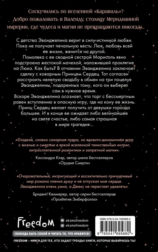 Помолвка с ее сводной сестрой Марисоль явно связана с проклятием жестокой мачехи. Как быть? В отчаянии Эванджелина заключает сделку с коварным Принцем Сердец. Принц согласен расстроить нелепую свадьбу в обмен на три поцелуя Эванджелины, подаренных тому, кого он выберет сам в нужное время.