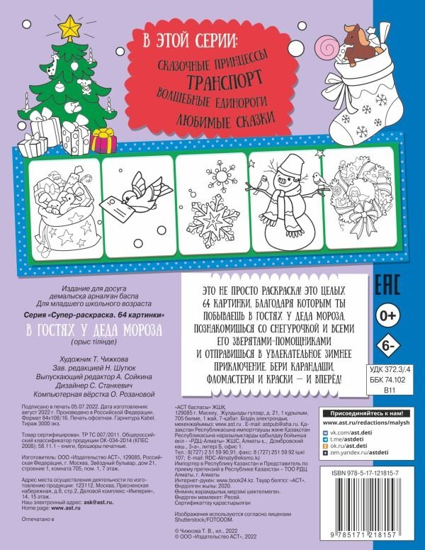 Это не просто раскраска! Это целых 64 картинки, благодаря которым ты побываешь в гостях у Деда Мороза, познакомишься со Снегурочкой и всеми его зверятами-помощниками и отправишься в увлекательное зимнее приключение. Бери карандаши, фломастеры и краски – и вперёд!