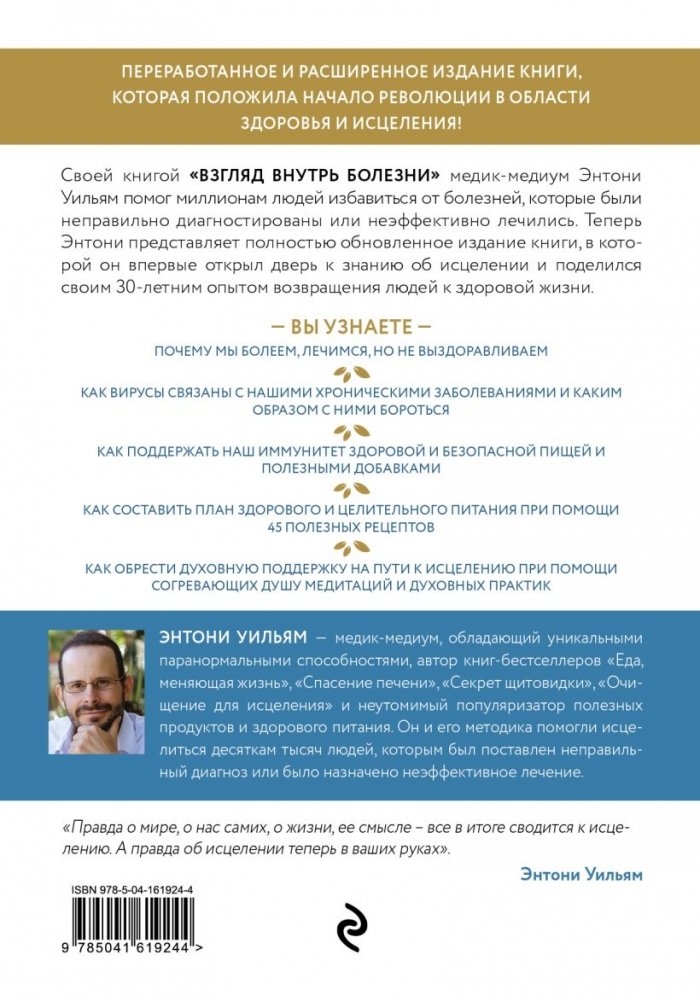 В своей книге Энтони Уильям раскрывает причины более 20 тяжелых заболеваний, в том числе и аутоиммунных расстройств, а также дает обновленные и дополненные рекомендации, как встать на путь исцеления с помощью полезных продуктов и микроэлементов, и минимизировать вред, который окружающая среда и современный образ жизни причиняют нашему здоровью. Книга дополнена цветной вклейкой с 45 рецептами вкусных и полезных блюд, а также информацией о том, как обрести духовную поддержку на пути к исцелению при помощи согревающих душу медитаций и духовных практик.