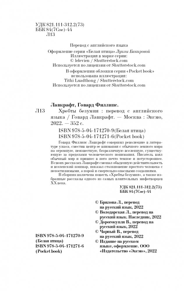 В сборник включена повесть «Хребты безумия», а также избранные рассказы одного из самых влиятельных мифотворцев XX века.