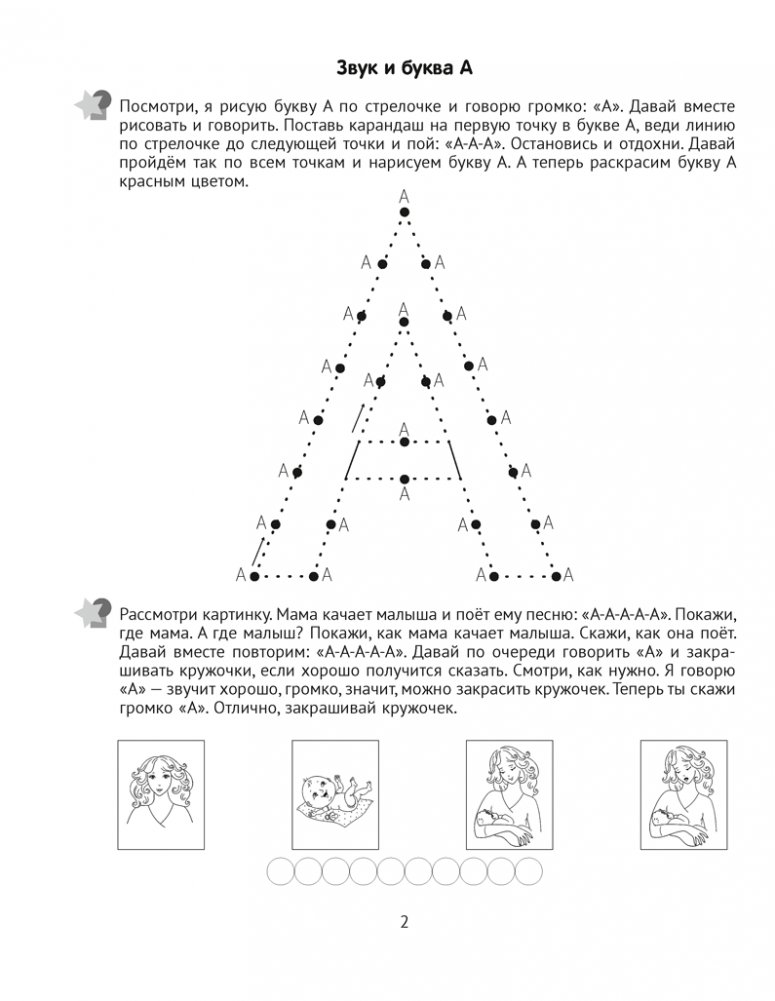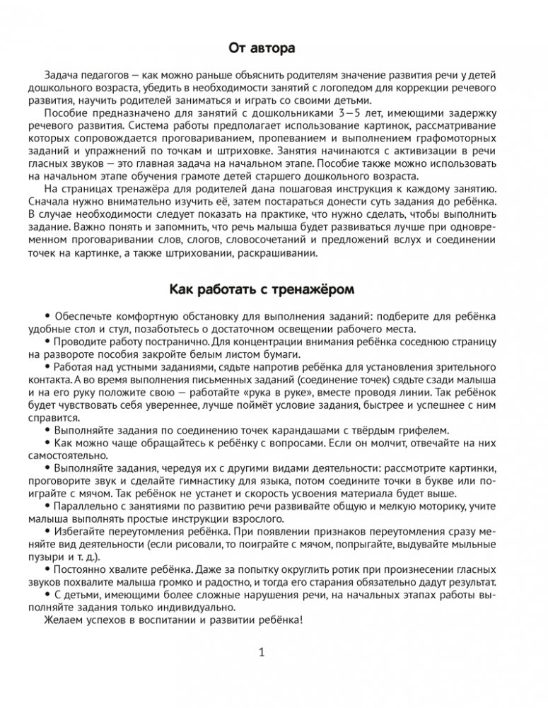 Пособие предназначено для занятий с дошкольниками 3—5 лет, имеющими задержку речевого развития. Система работы предполагает использование картинок, рассматривание которых сопровождается проговариванием, пропеванием и выполнением графомоторных заданий и упражнений по точкам и штриховке. К каждому занятию тренажёра дана пошаговая инструкция.