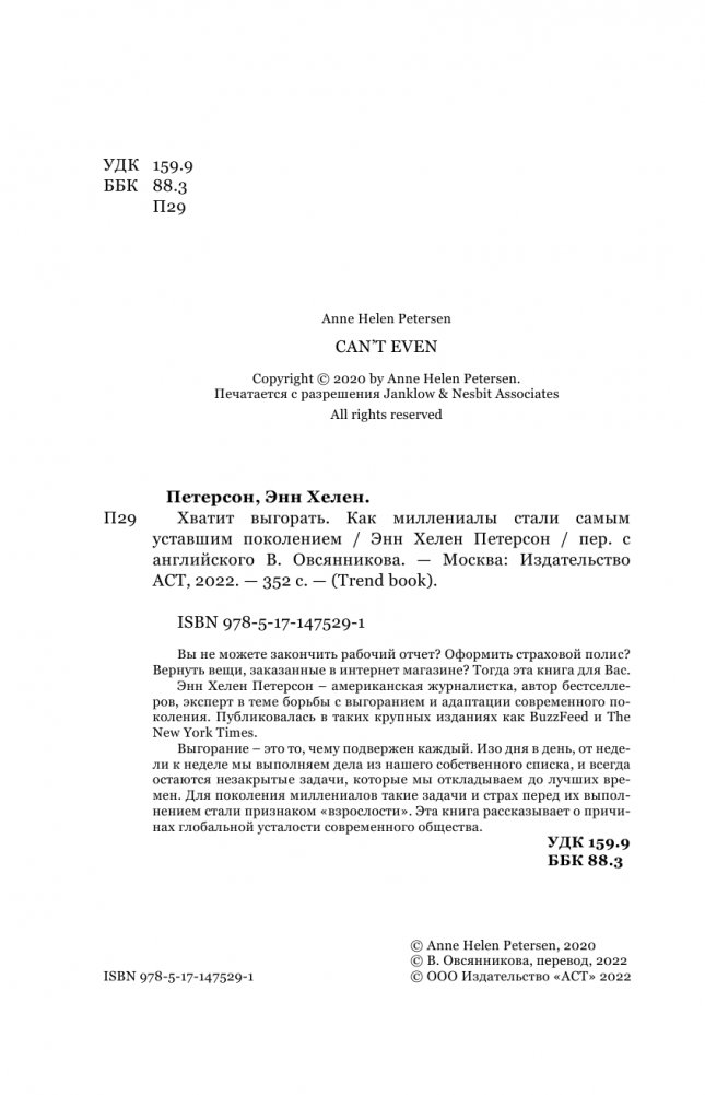 Энн Хелен Петерсон – американская журналистка, автор бестселлеров, эксперт в теме борьбы с выгоранием и адаптации современного поколения. Публиковалась в таких крупных изданиях как BuzzFeed и The New York Times.