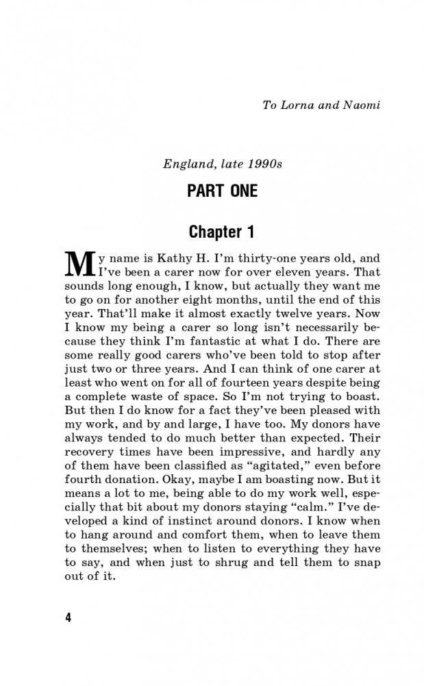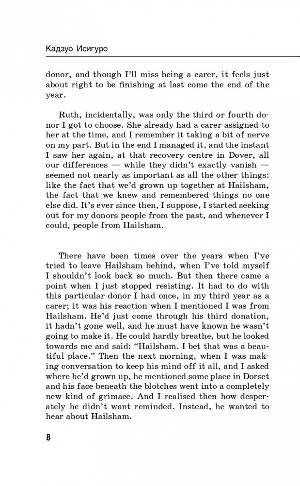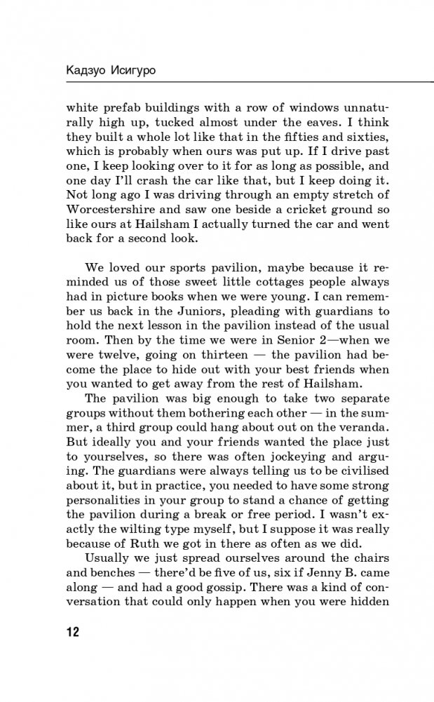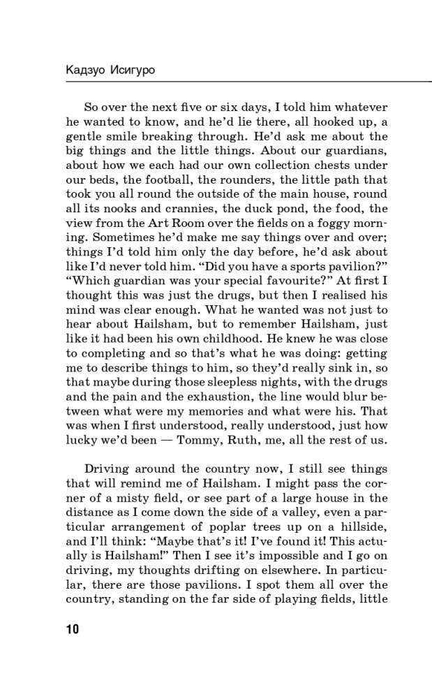 Тридцатилетняя Кэти вспоминает свое детство в привилегированной школе Хейлшем, полное странных недомолвок, половинчатых откровений и подспудной угрозы. Она словно путешествует во времени, остро чувствуя произошедшие вокруг изменения, и рассказывает о том, что случилось.