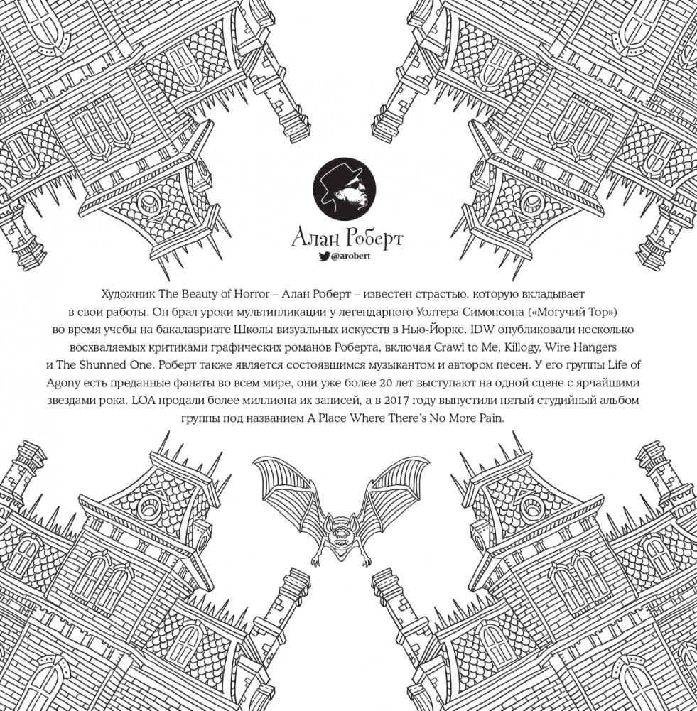 Создатель «Страшно, но красиво» — Алан Роберт — известный художник-иллюстратор и бас-гитарист американской рок-группы Life of Agony, автор графических романов Crawl to Me, Killogy, Wire Hangers и The Shunned One. Его серия раскрасок The Beauty of Horror, первая часть которой перед вами, стала бестселлером Amazon и завоевала весь мир! Она получила признание публики благодаря неповторимому и особенному стилю художника, его рисунки одновременно ужасны и прекрасны.