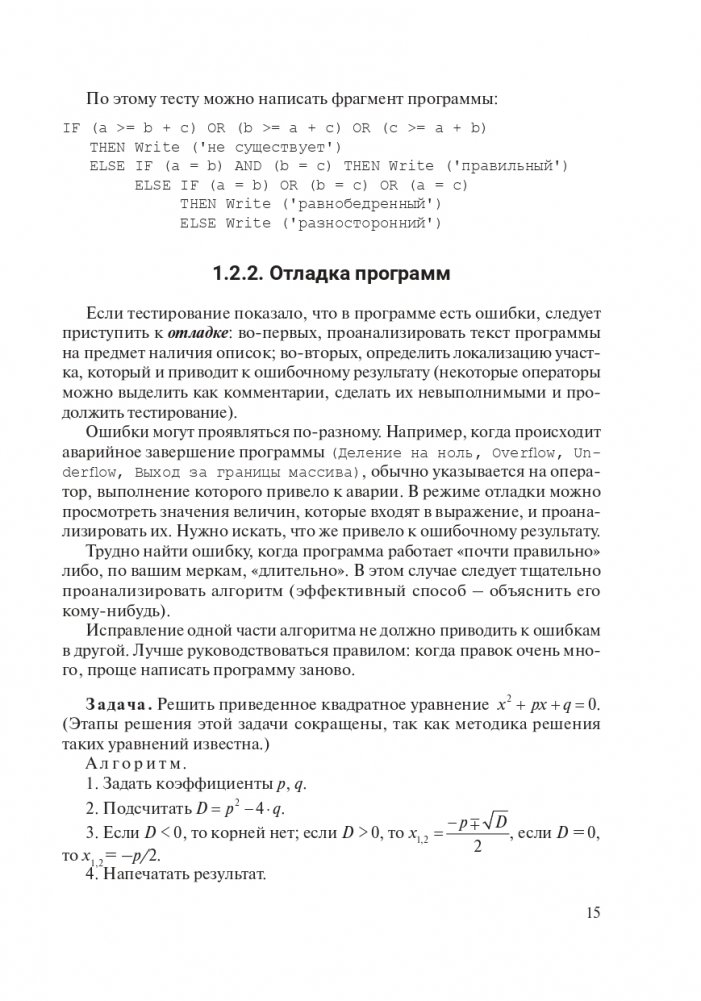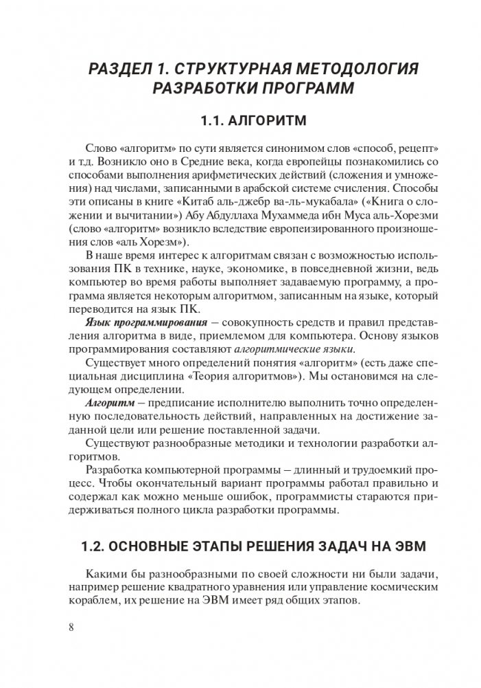 Представлено последовательное изложение основ программирования на примере языка Pascal. Рассматриваются структурная, модульная и объектно-ориентированная технологии программирования, методы проектирования и отладки программ, управляющие операторы, основные структуры данных и методы их обработки. Полностью соответствует типовой программе «Методы программирования и информатика» для научно-педагогического направления. Наряду с теоретическим изложением материала широко представлены иллюстративные примеры. Книга содержит задания для самостоятельной работы. Пособие также можно рекомендовать при подготовке школьников к олимпиадам по программированию.