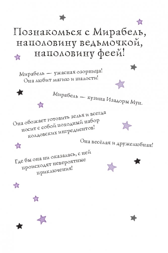 Познакомьтесь с Мирабель, кузиной Изадоры Мун! Наполовину ведьмочка, наполовину фея, она обожает шалости! И иногда из-за этого с ней приключаются разные неприятности. И всё же Мирабель знает: главное — оставаться собой и быть честной с родными и друзьями.