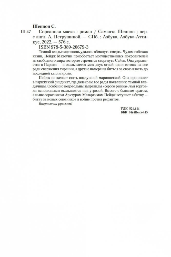 Темной владычице вновь удалось обмануть смерть. Чудом избежав казни, Пейдж Махоуни приобретает могущественных покровителей из свободного мира, которые стремятся свергнуть Сайен. Она укрывается в Париже — и оказывается меж двух огней: одни готовы на все ради свержения тирании, а другие намерены биться за свою власть до последней капли крови. Пейдж не желает стать послушной марионеткой. Она проникает в парижский синдикат, где далеко не все рады появлению темной владычицы. Особенно недовольны заправилы «серого рынка», чья торговля ясновидцами оказывается под угрозой. Вместе с бывшим врагом, а ныне соратником Арктуром Мезартимом Пейдж вступает в битву — битву за новых союзников в войне против рефаитов. Впервые на русском!