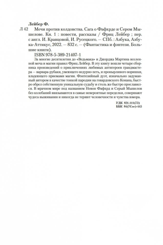 За многие десятилетия до «Ведьмака» и Джорджа Мартина вселенной меча и магии правил Фриц Лейбер. В эту книгу вошли четыре сборника произведений о приключениях любимых антигероев грандмастера — варвара-рубаки, умеющего недурно петь, и пронырливого воришки, владеющего приемами магии. Фэнтезийный дуэт, изначально задуманный автором в качестве тонкой пародии на говардовского Конана, быстро обрел собственную уникальную судьбу и столь же быстро прославился. В мрачном мире под названием Невон Фафхрд и Серый Мышелов без колебаний ввязываются в самые невероятные переделки, совершают чудеса выживания и никогда не теряют человечности и чувства юмора.