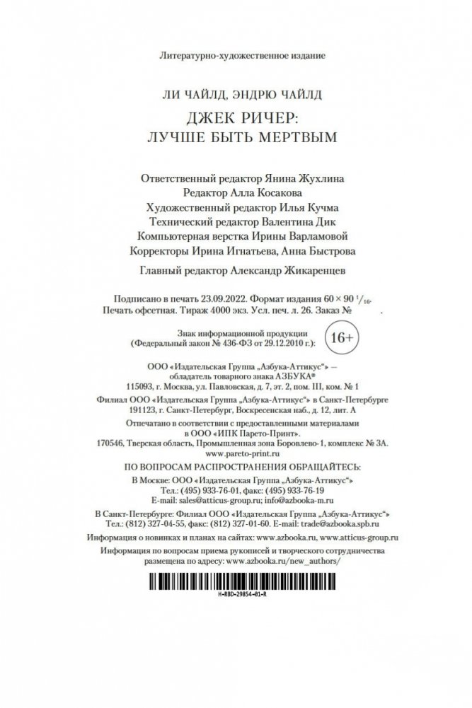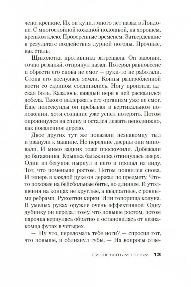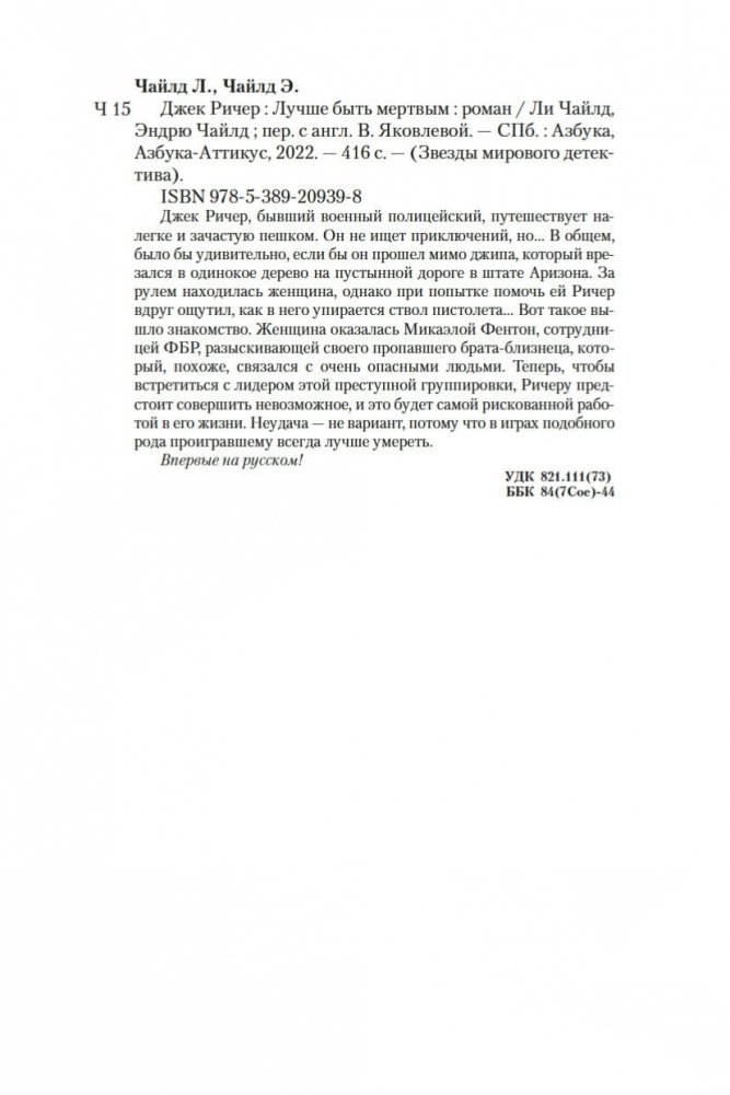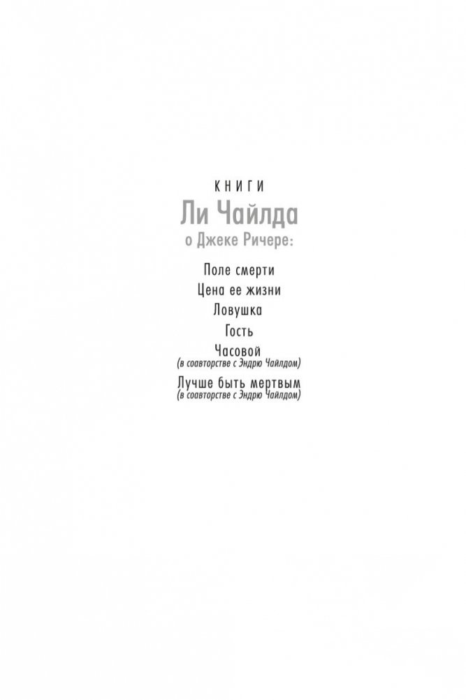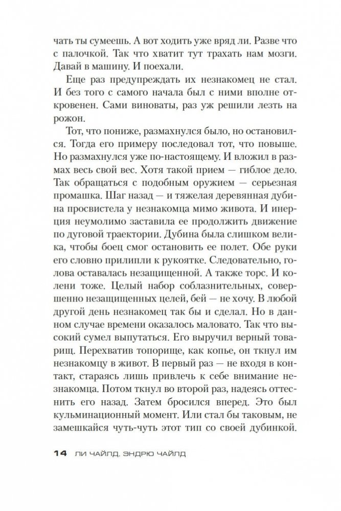 Джек Ричер, бывший военный полицейский, путешествует налегке и зачастую пешком. Он не ищет приключений, но... В общем, было бы удивительно, если бы он прошел мимо джипа, который врезался в одинокое дерево на пустынной дороге в штате Аризона. За рулем находилась женщина, однако при попытке помочь ей Ричер вдруг ощутил, как в него упирается ствол пистолета... Вот такое вышло знакомство. Женщина оказалась Микаэлой Фентон, сотрудницей ФБР, разыскивающей своего пропавшего брата-близнеца, который, похоже, связался с очень опасными людьми. Теперь, чтобы встретиться с лидером этой преступной группировки, Ричеру предстоит совершить невозможное, и это будет самой рискованной работой в его жизни. Неудача — не вариант, потому что в играх подобного рода проигравшему всегда лучше умереть. Впервые на русском!