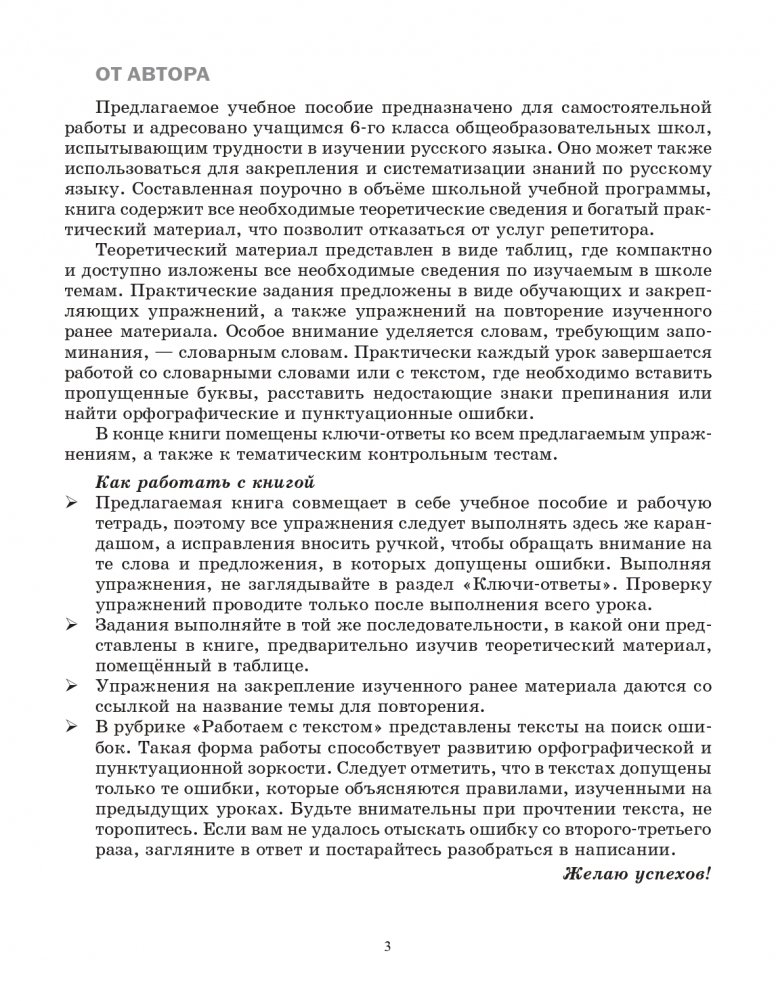 Книга адресована учащимся 6 класса, испытывающим трудности в изучении русского языка. Она составлена так, чтобы ребенок мог сам легко и быстро усвоить материал школьной программы. Пособие содержит все необходимые теоретические сведения и разнообразные практические задания, тем самым совмещая в себе учебное пособие и рабочую тетрадь, поэтому все упражнения ребенок сможет выполнять прямо в книге. Здесь же приводятся ключи-ответы ко всем упражнениям и тестам. Новая редакция содержит существенные улучшения и дополнения, еще ближе к школьной программе и для удобства восприятия выполнена в двухцветной печати.
